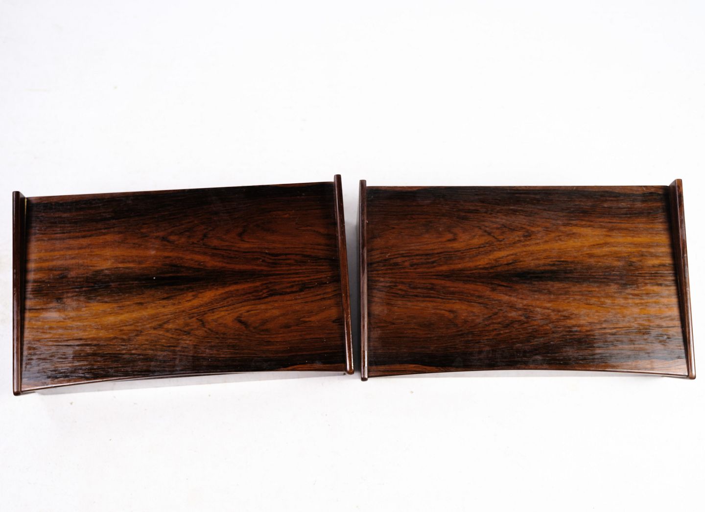 SoldA set of wall-hung bedside tables in rosewood with drawers appears with stamps of Ølholm Møbelfabrik, Horsens from around the 1960s.