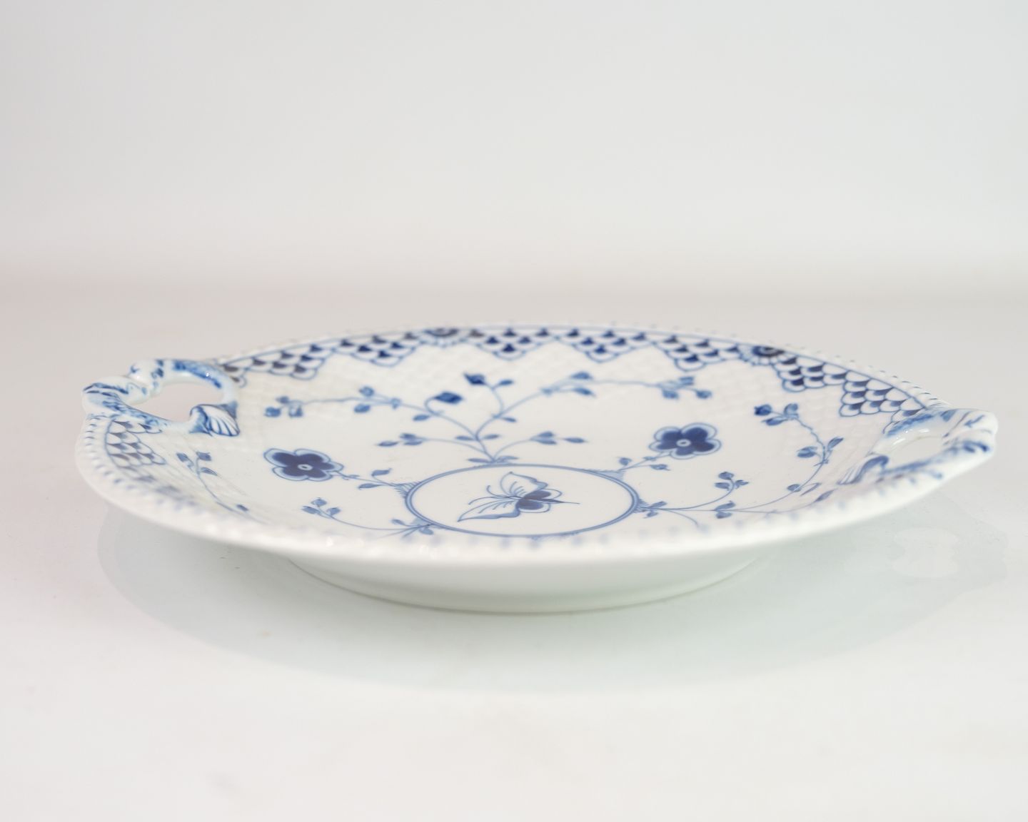 Round cake plate with handle, model no. 304, from Bing & Grondahl. Decorated with Butterfly motif. Porcelain with printed stamp under the base. Suitable for serving or collecting.