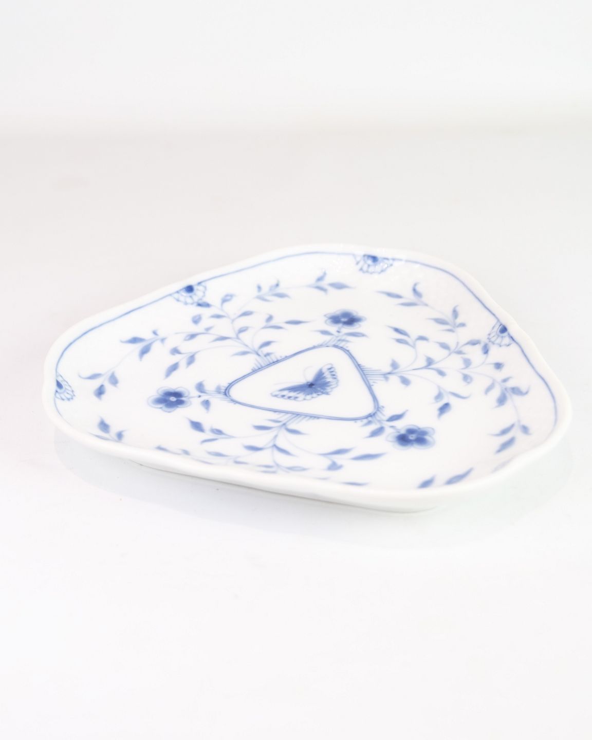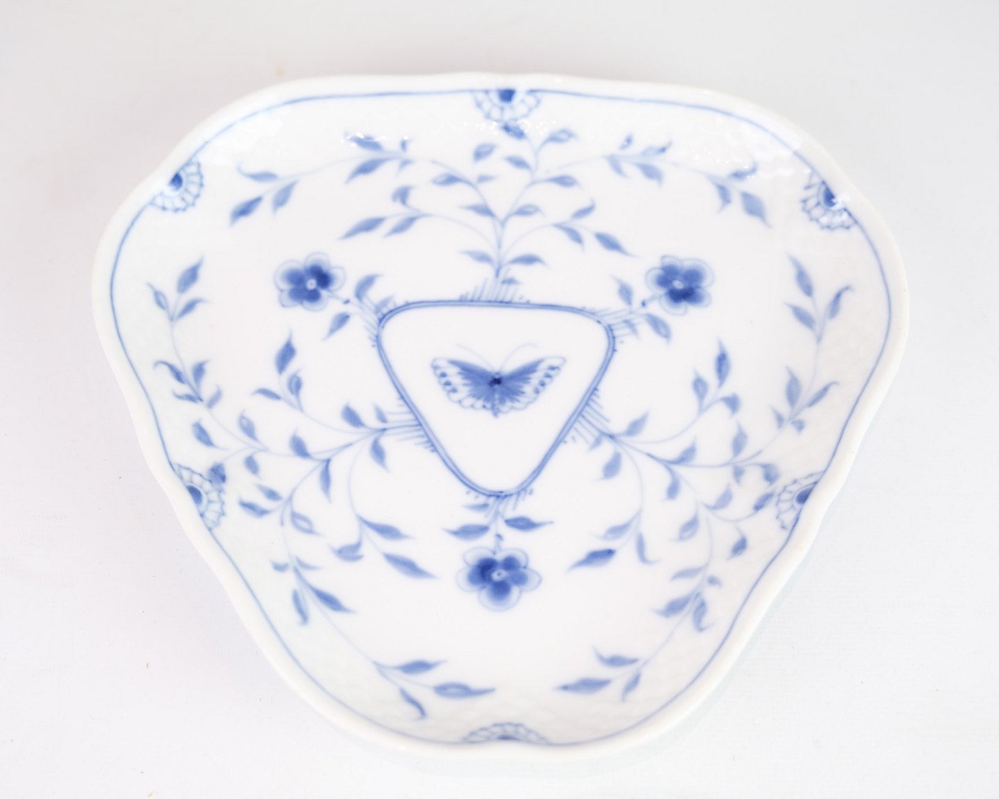 Triangular dish no. 4 from Bing & Grondahl. Made of porcelain with hand-painted butterfly motif. Unique shape, suitable for serving or as a decorative element. Stamped under the bottom.