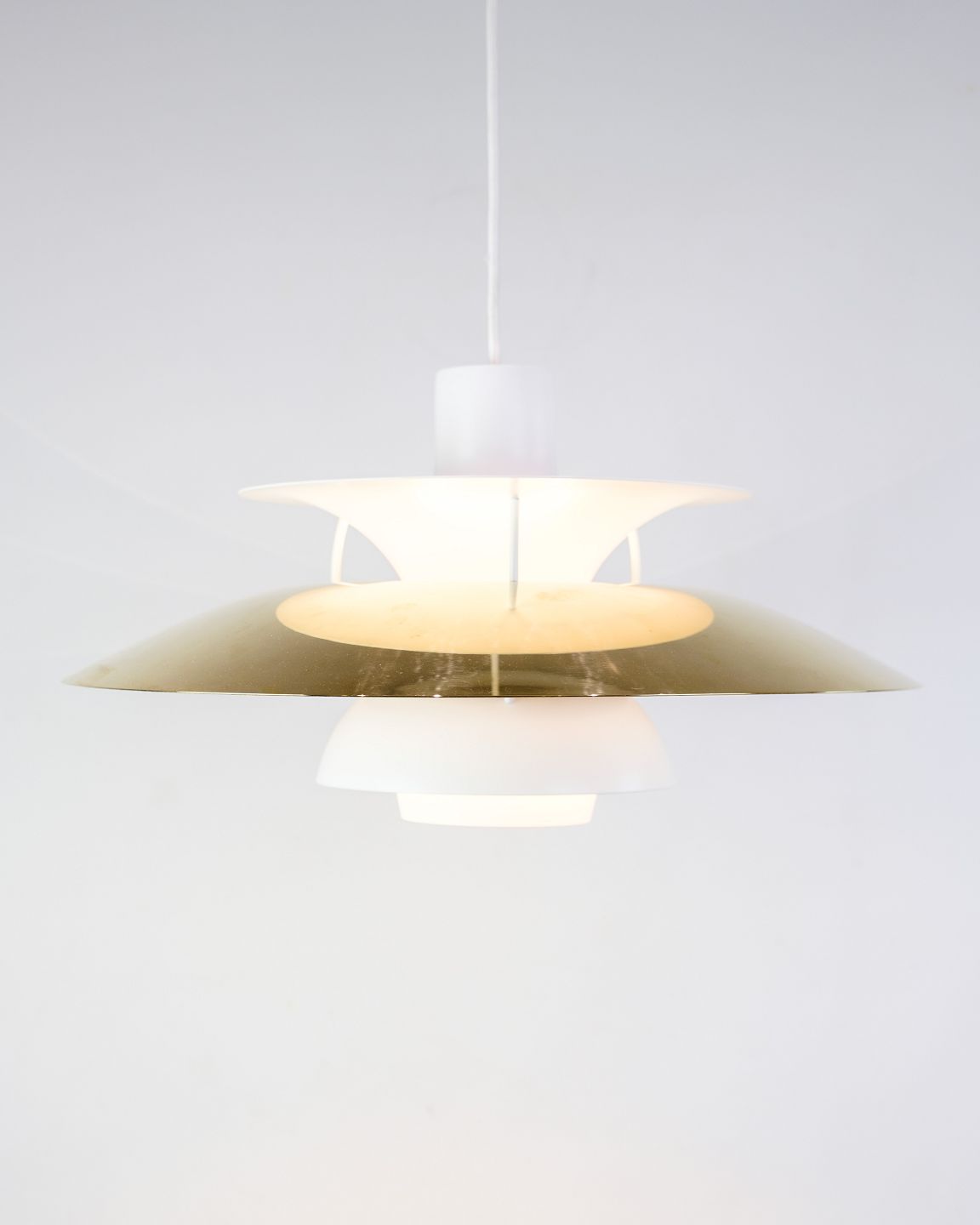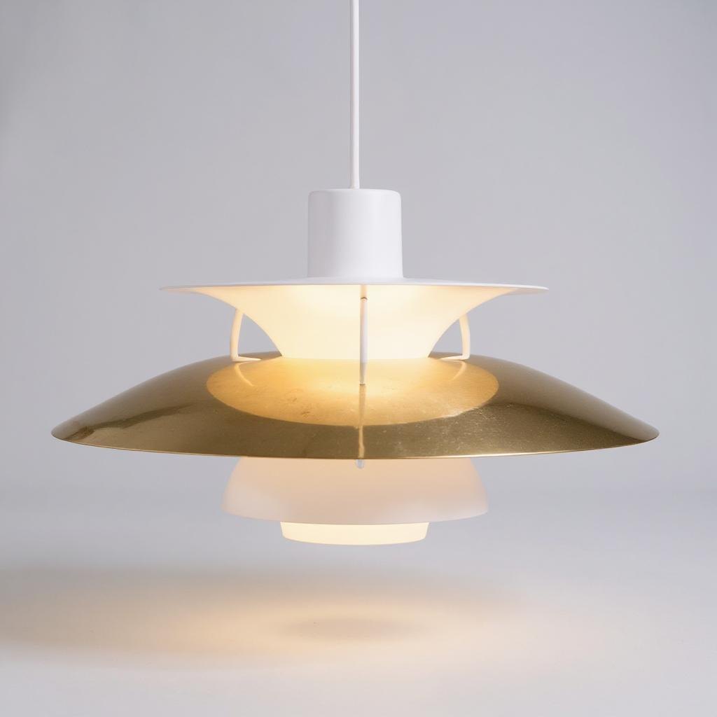 Brass pendant lamp, model PH5 manufactured by Louis Poulsen and designed by Poul Henningsen in 1958. The design is very unique on this lamp, because it emits a glare-free warm light, which is ideal especially over the dining table. The lamp will be inspected in our workshop before delivery. We have several in stock so ask for stock quantity if desired.