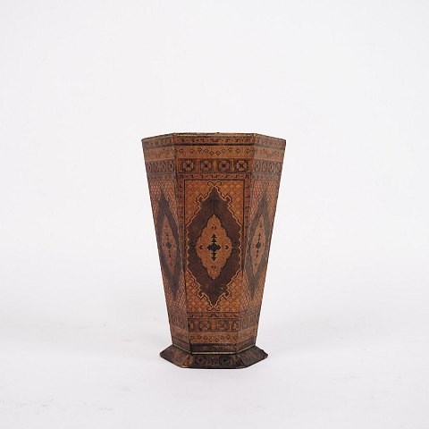 Dekorativ vase fra 1900-tallet, udført i mørkt træ med smukt orientalsk inspireret intarsia.