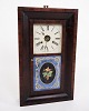 Dekorativt amerikanerur fra 1800-tallet, udført i mørkt træ. Uret har en klassisk urskive med romertal og en bemalet glasrude, der giver et charmerende og tidstypisk udtryk.