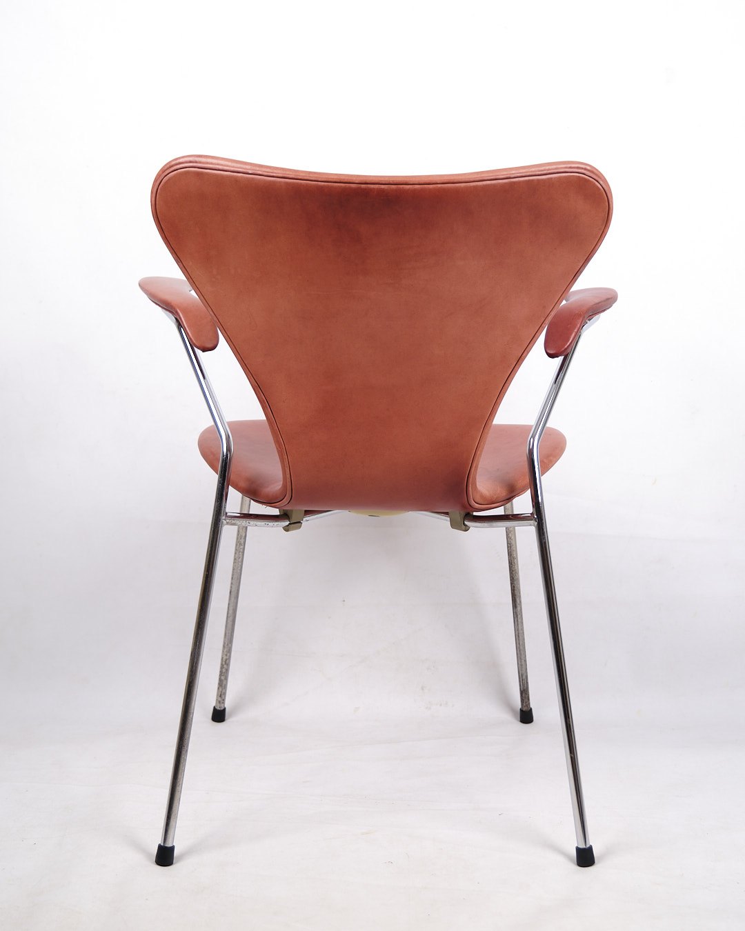 Arne Jacobsen Syverstol med armlæn, model 3207. Cognacfarvet læder og kromstel. Fritz Hansen designklassiker.