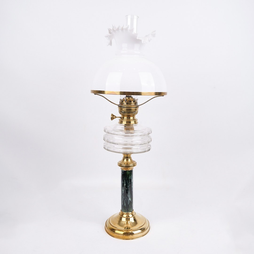 SoldAntique kerosene lamp from the 1880s, manufactured by Fynsk Glasværk. The lamp is made of brass with a marbled base and a white dome in opal glass, which gives a soft and atmospheric light.