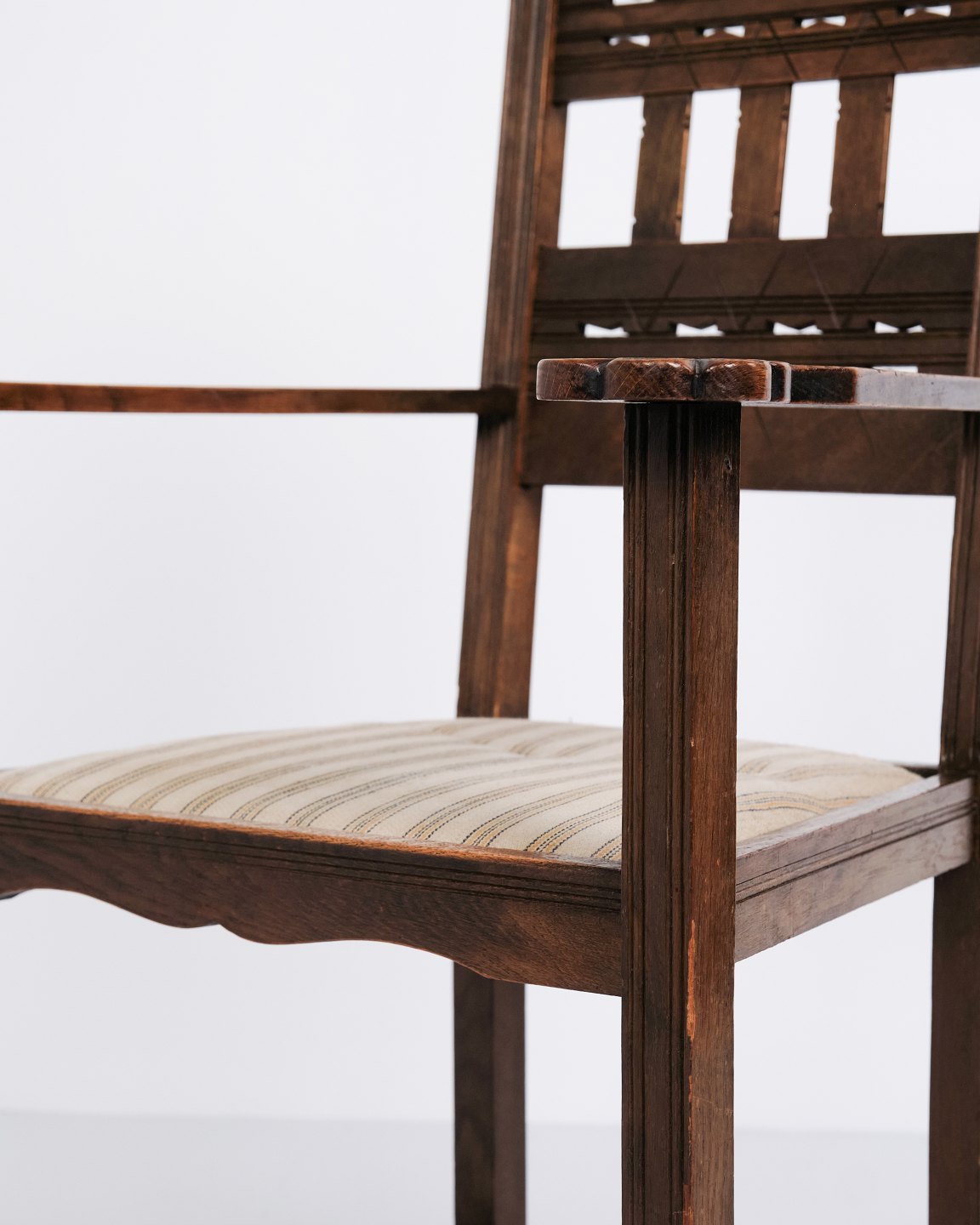 Antik armstol i egetræ fra 1930’erne med stribet polstring.