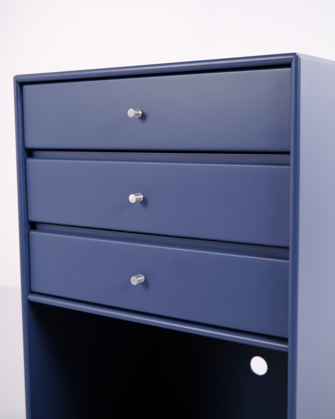 Montana reol i blå. Indrettet med tre skuffer og én åben hylde, velegnet til både opbevaring og display. Et klassisk Montana-modul, der kombinerer funktionalitet og enkelt design.
