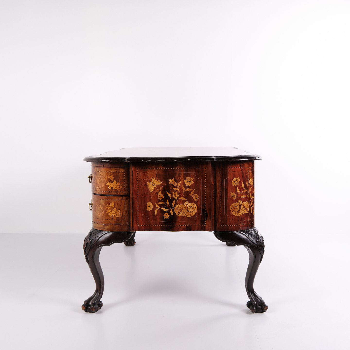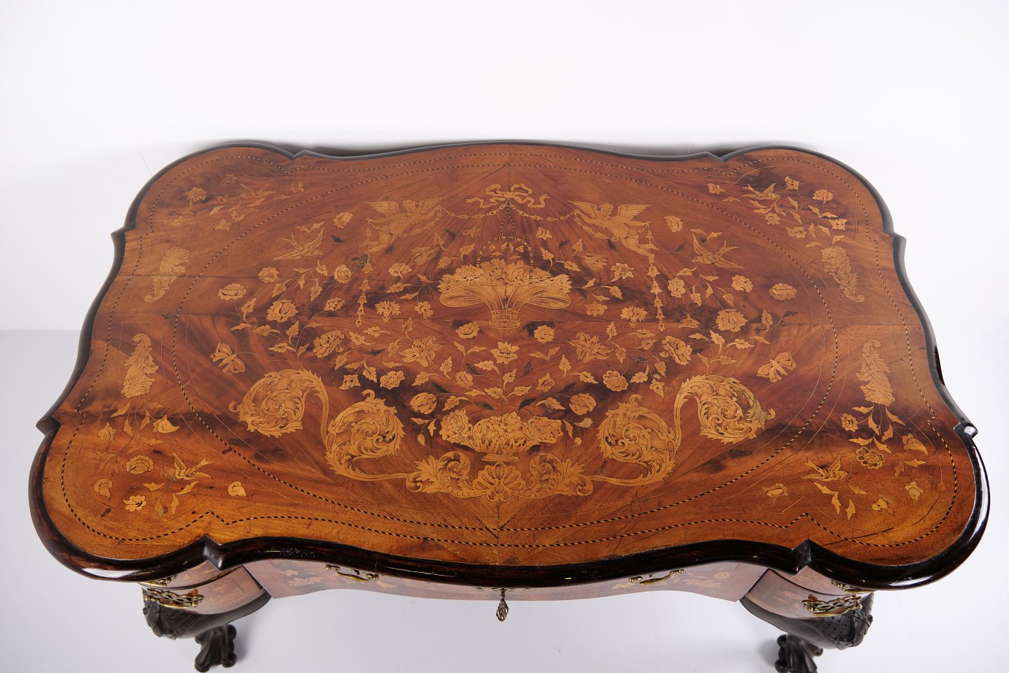 Skrivebord fra ca. 1860, udført i nøddetræ med detaljeret frugttræ-intarsia på både top og sider. Bordet er håndpoleret med shellak, hvilket giver en dyb glød og fremhæver det fine håndværk. Et elegant antikt møbel med rige dekorationer og solide materialer.