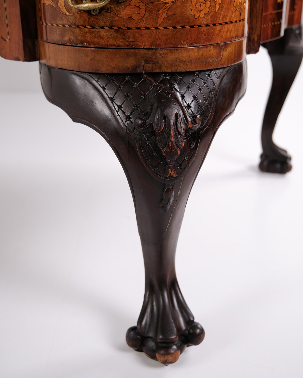 — Materiale: Nøddetræ med frugttræ intarsia, shellakpoleret