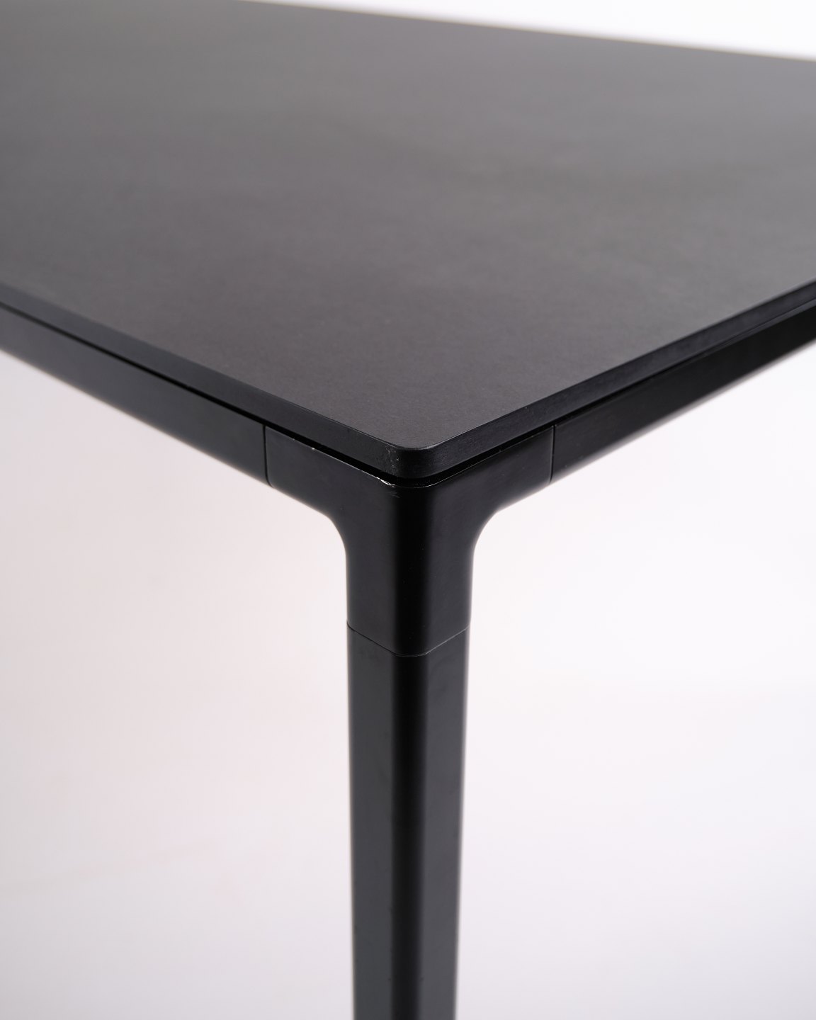 HAY T12 spisebord med sort linoleumsbordplade og stel i sort pulverlakeret aluminium. Et stilrent og rummeligt bord med bløde hjørner og god plads til både spise- og arbejdsbrug.