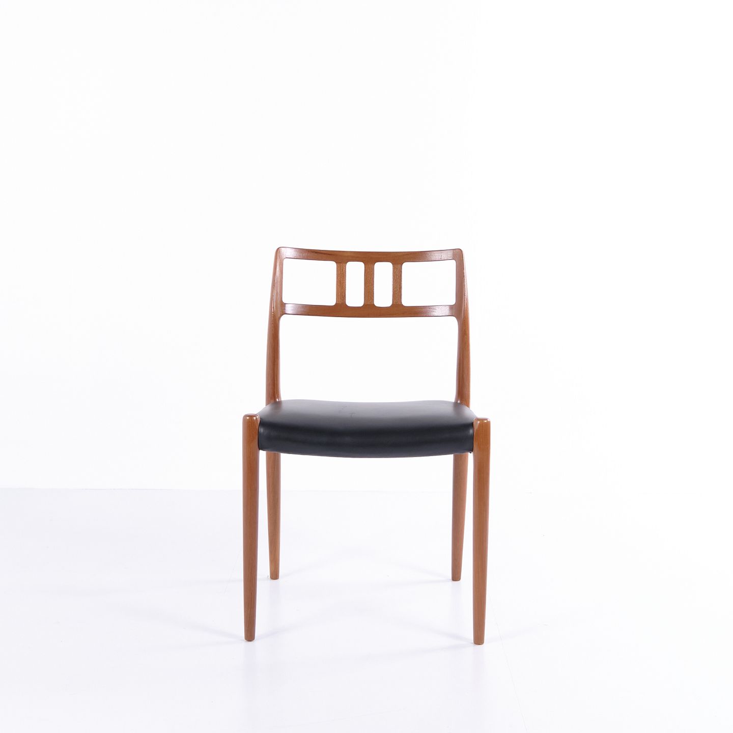 Spisebordsstol model 79, designet af Niels Otto Møller og fremstillet af JL Møllers Møbelfabrik i 1960’erne. Udført i teak med sort lædersæde. Et klassisk Møller-design, kendt for høj håndværkskvalitet og elegant form.