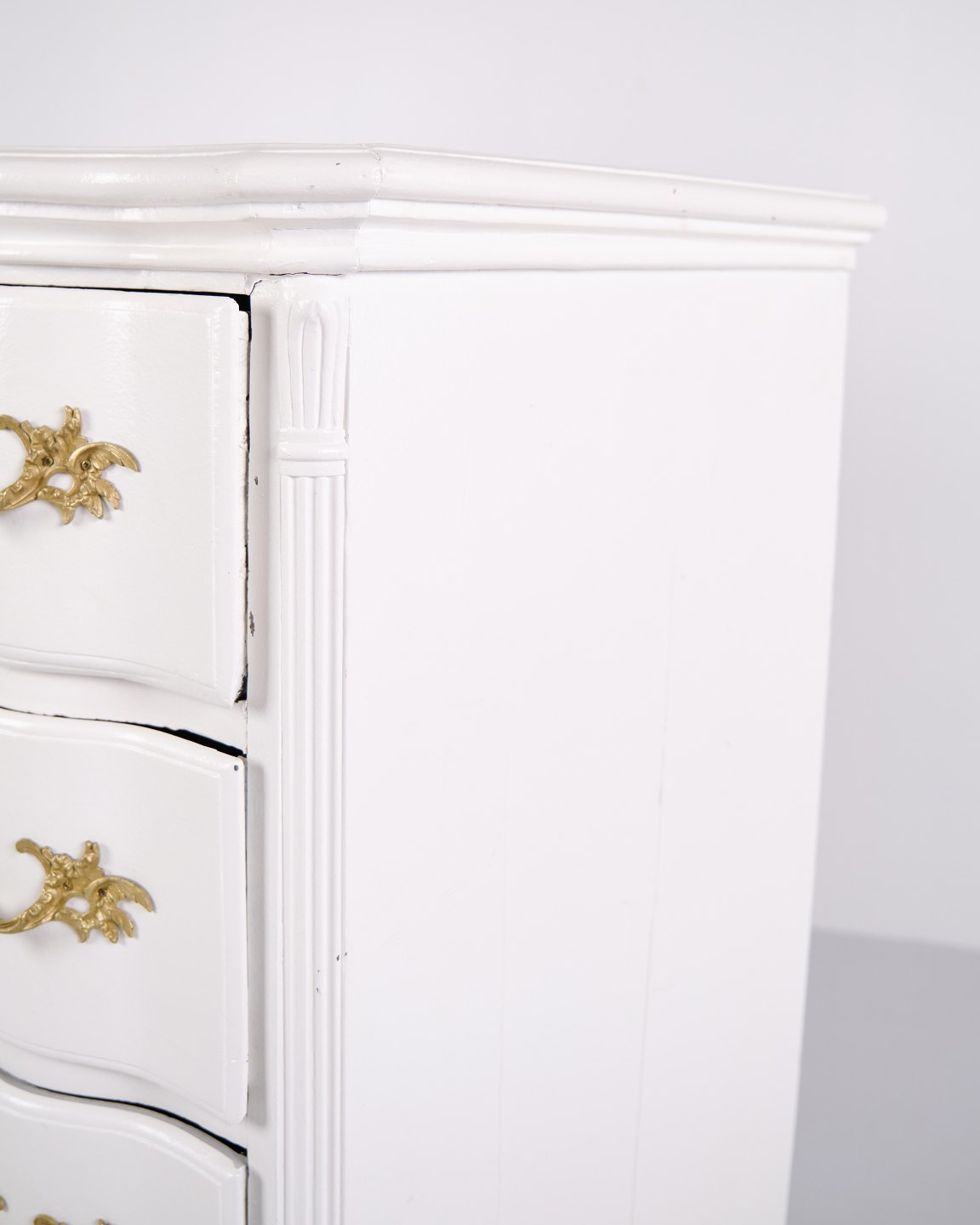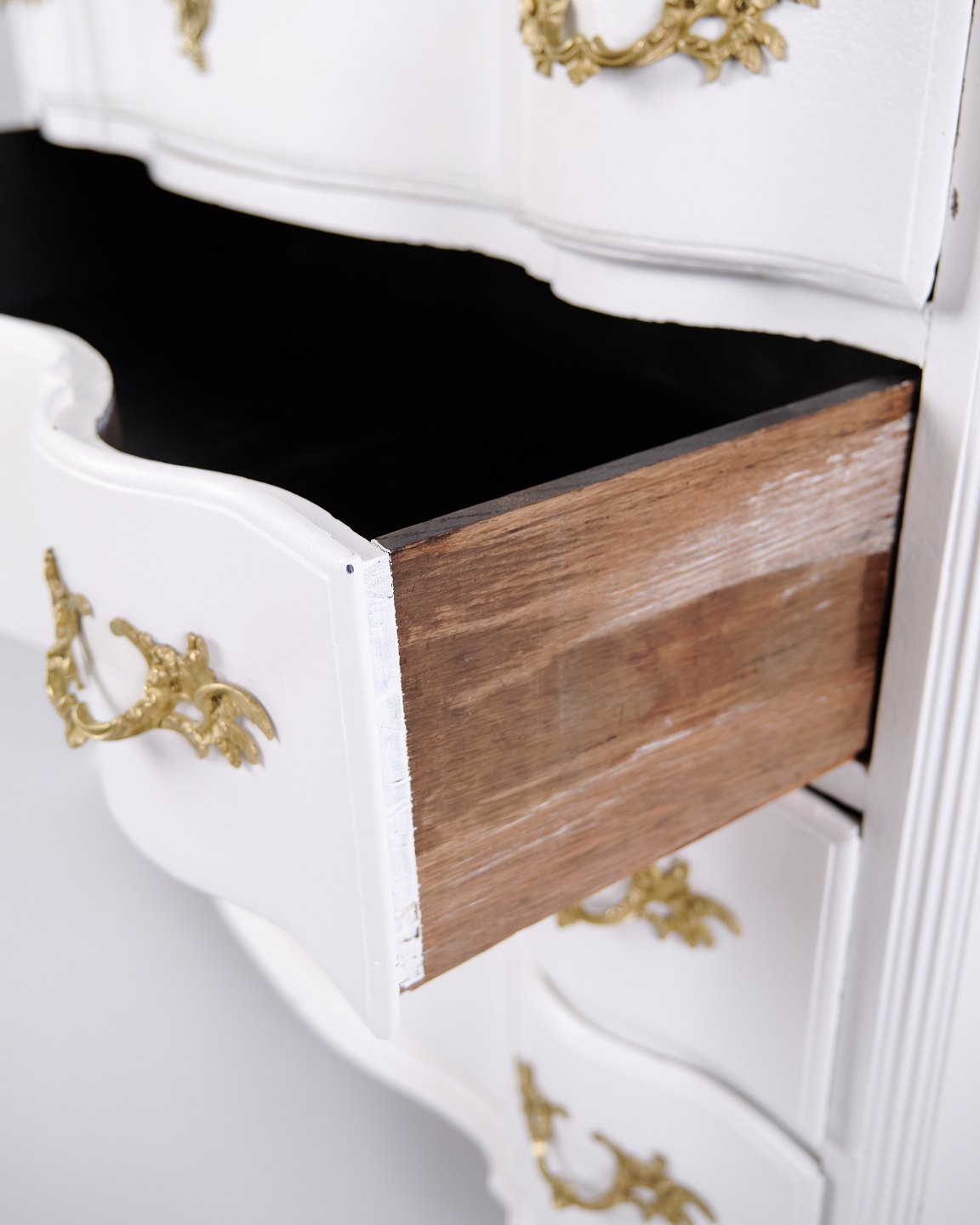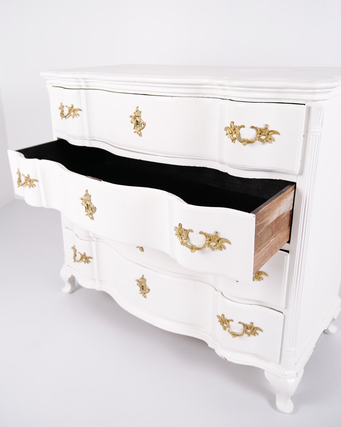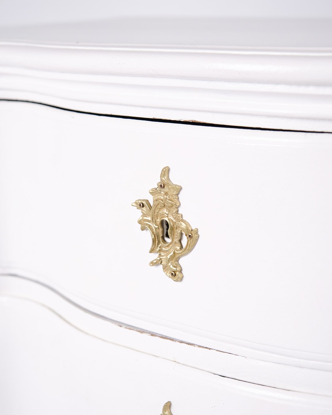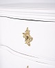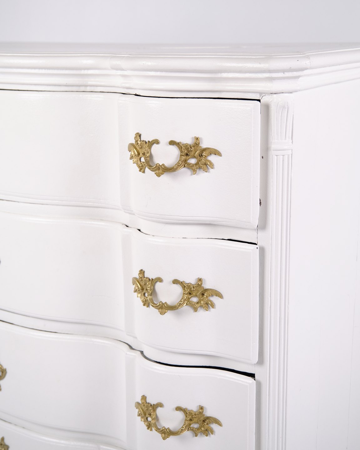 Antik barok kommode fra 1760’erne, hvidmalet med messinggreb. Fire skuffer og markant barokt formsprog. Historisk og dekorativt møbel.