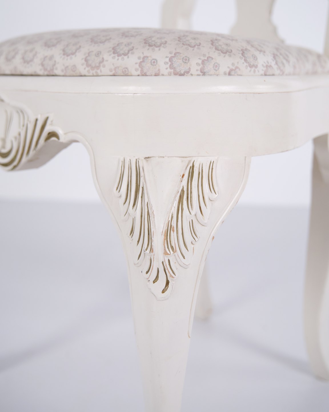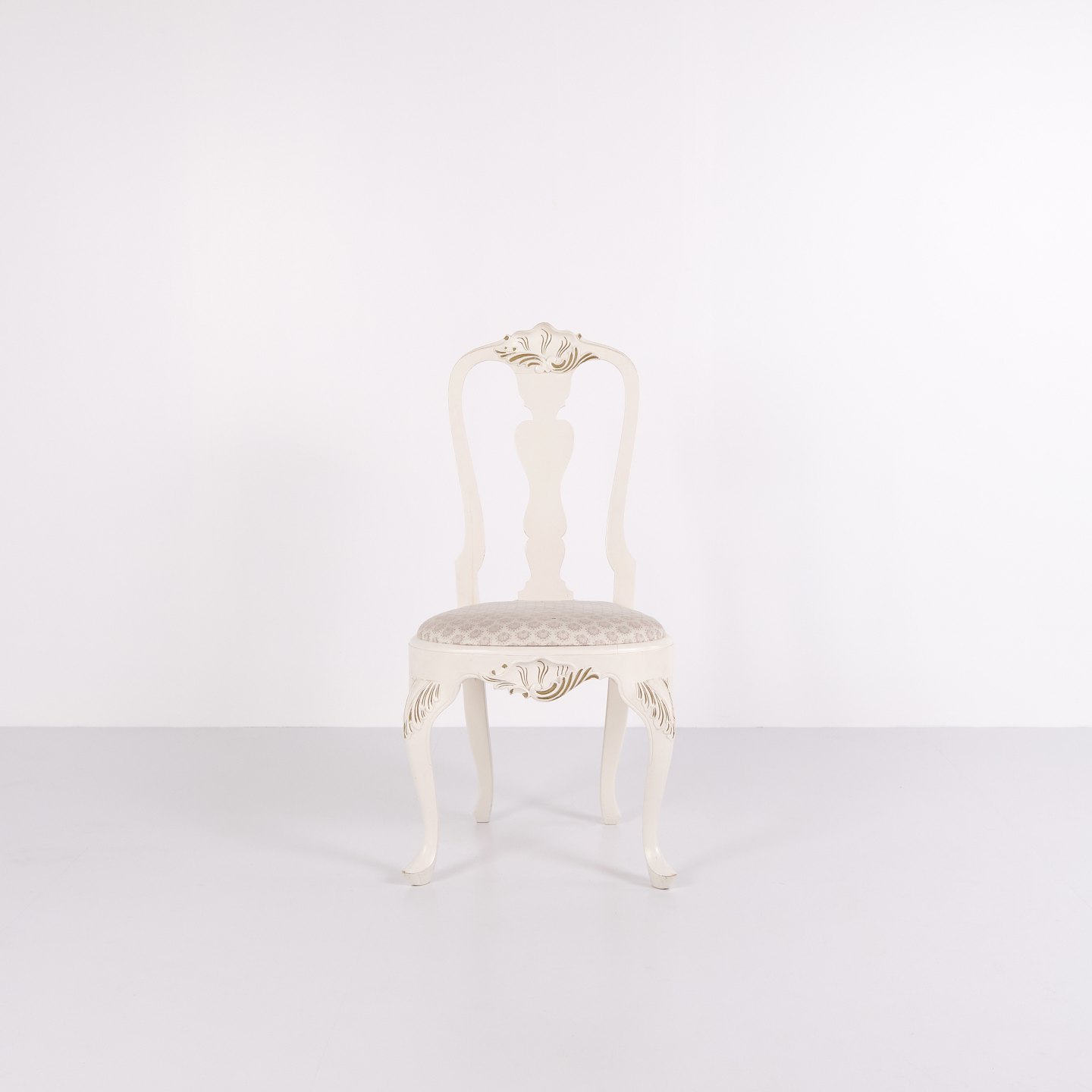 Antique dining chairs in neo rococo style from the 1920s. Set of 6 white painted chairs with decorative details.