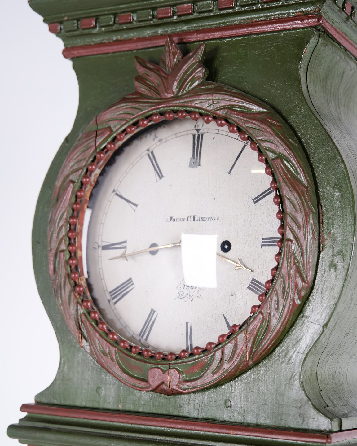 Bornholm longcase clock “frøken” model from the 1860s, hand-painted with carved details in green/red paint. Antique Bornholm clock from the 19th century.