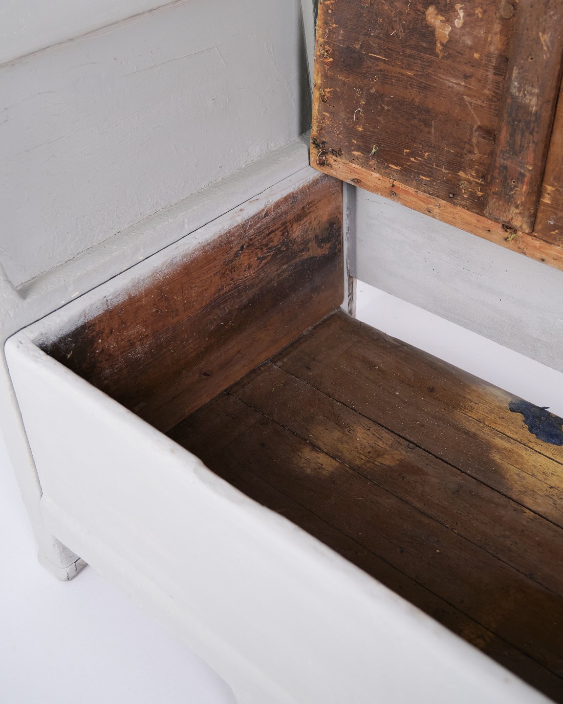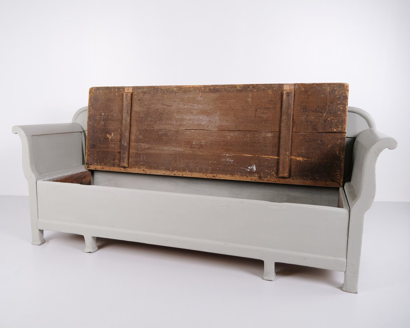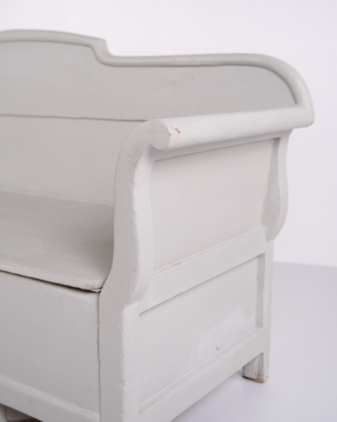 Antique storage bench from the 1890s in grey-painted pine wood. Antique storage bench from the 19th century.