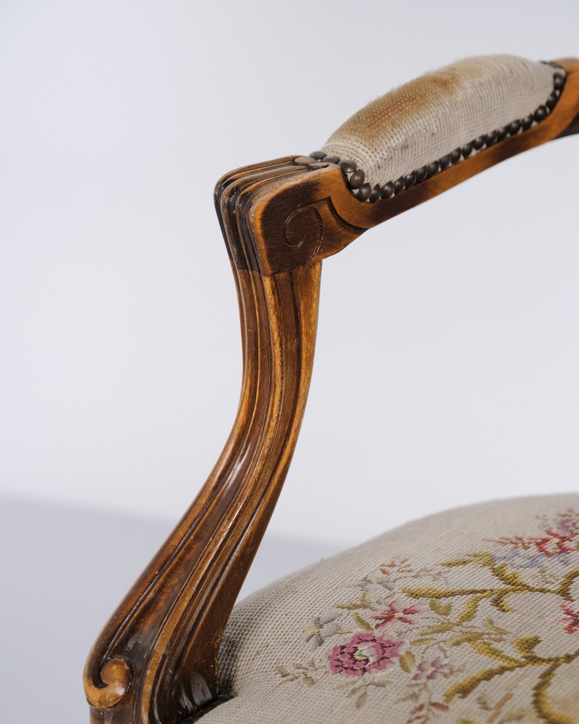 Neo-Rococo armchair from the 1930s with curved legs and floral fabric. Classic and decorative piece of furniture with a romantic expression.