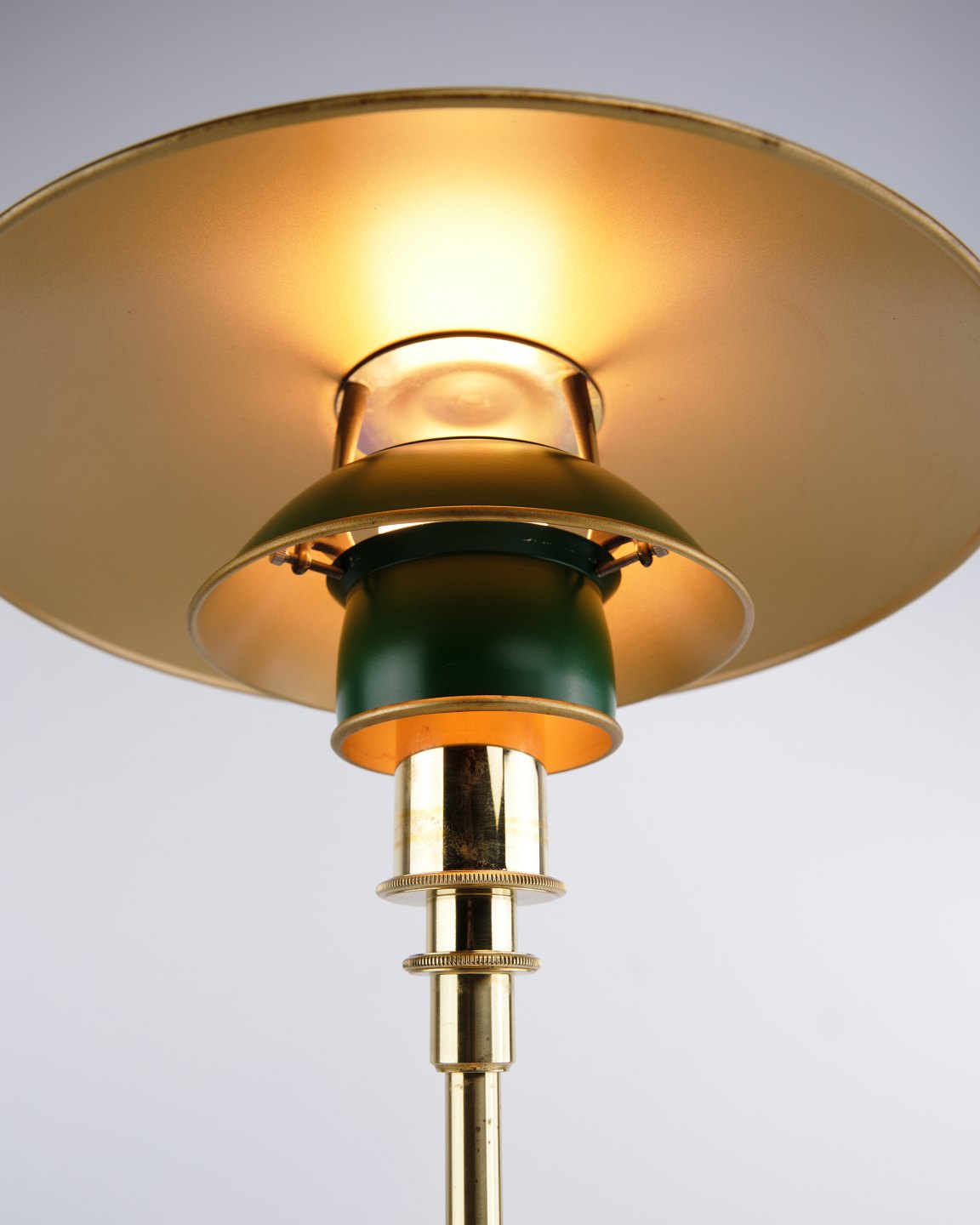 PH 3/2 table lamp designed by Poul Henningsen and released as an anniversary edition in 1996 by Louis Poulsen. The lamp is made in brass with green metal shades, giving a distinctive and classic expression. The model was only produced for a limited period and is also found in a variant with red metal shades.