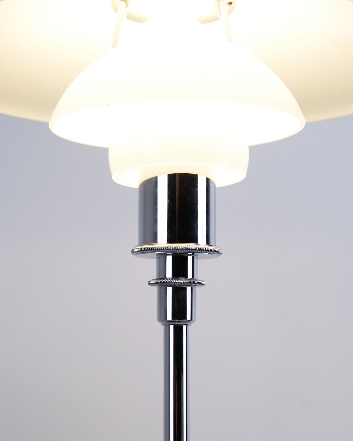 PH 3½-2½ floor lamp in chrome with opal glass from Louis Poulsen. Designed by Poul Henningsen with classic Danish lighting design and an elegant expression.