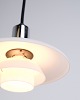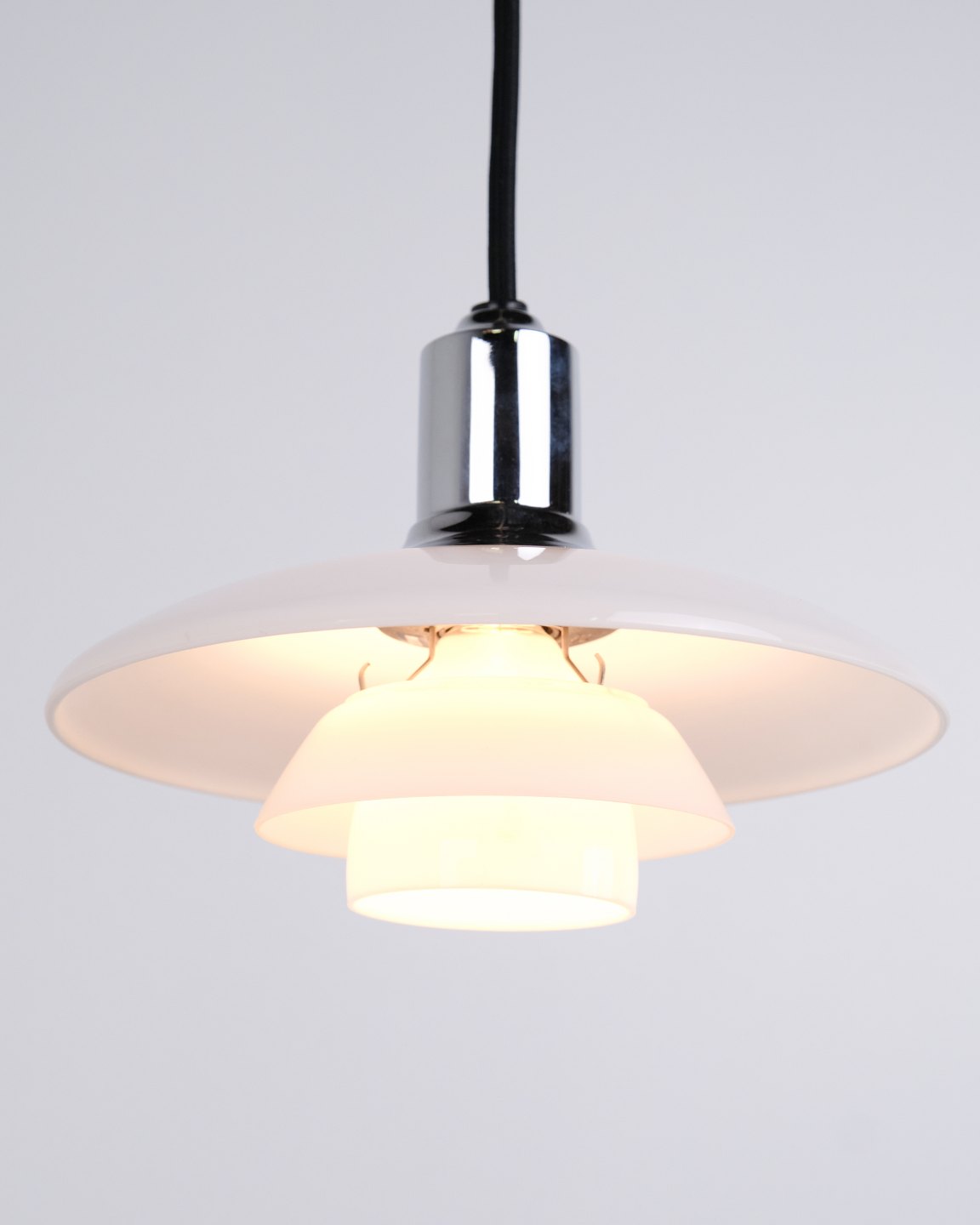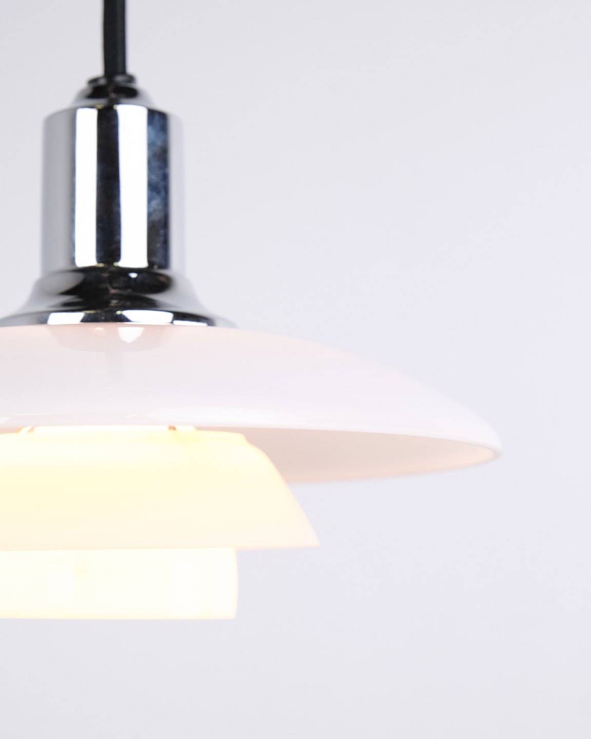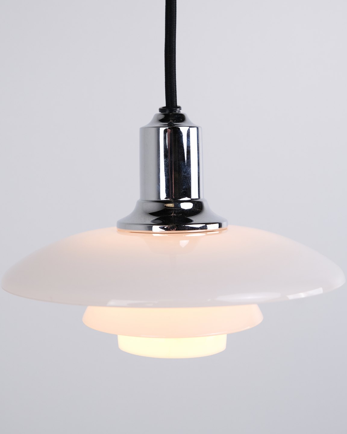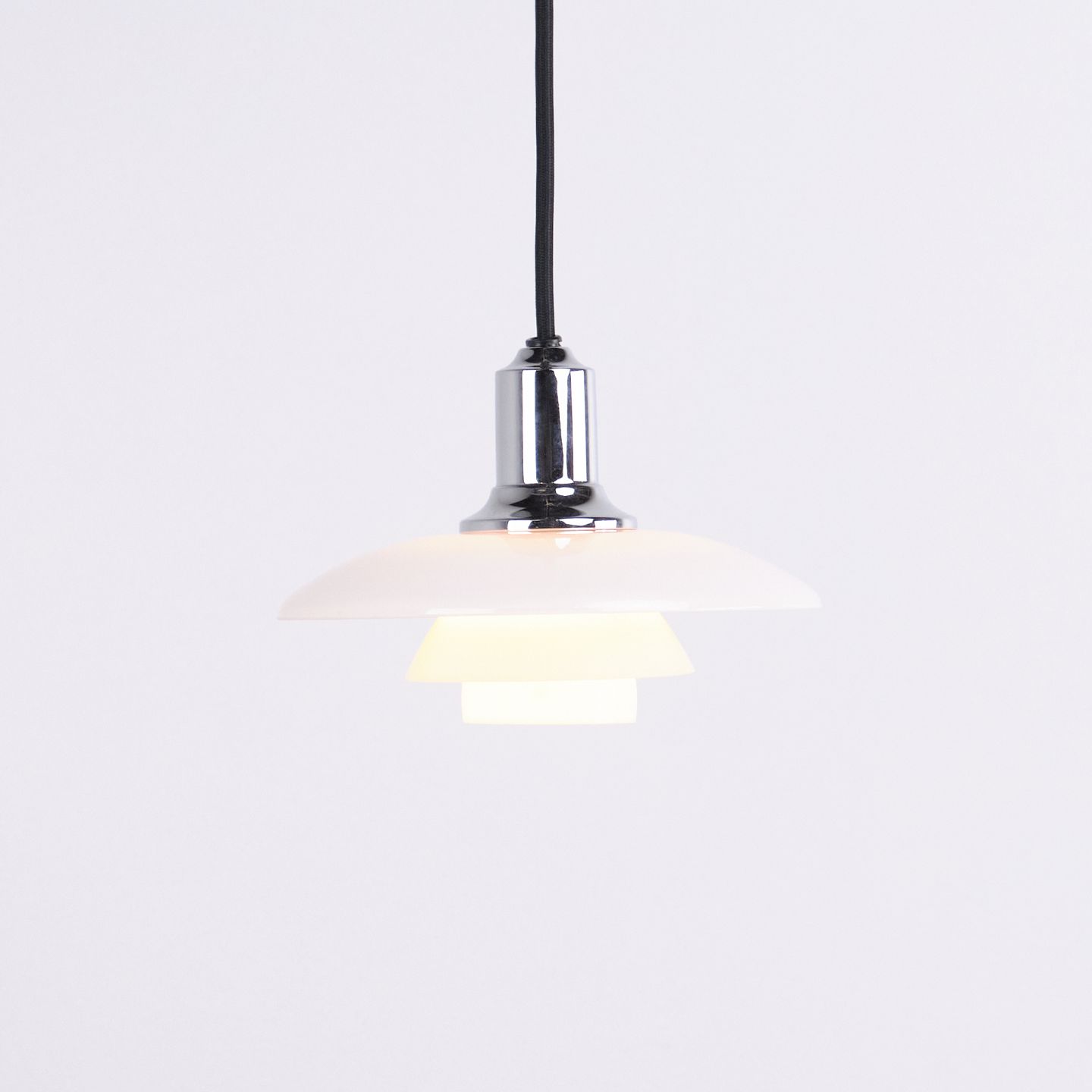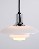 PH 2/1 pendant in chrome with opal glass from Louis Poulsen. Designed by Poul Henningsen with classic Danish lighting design and glare-free illumination.