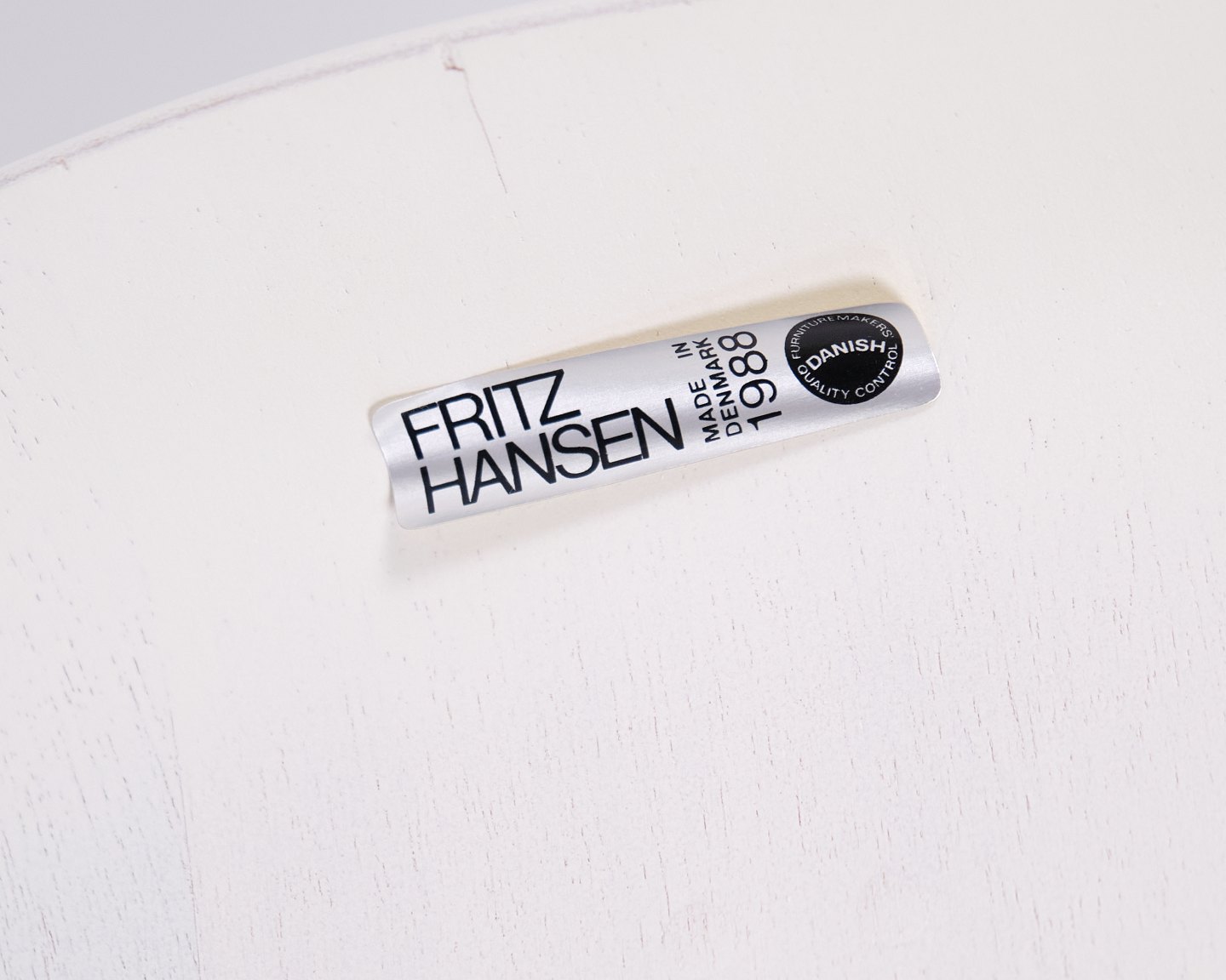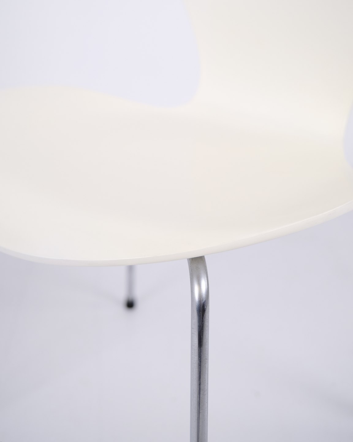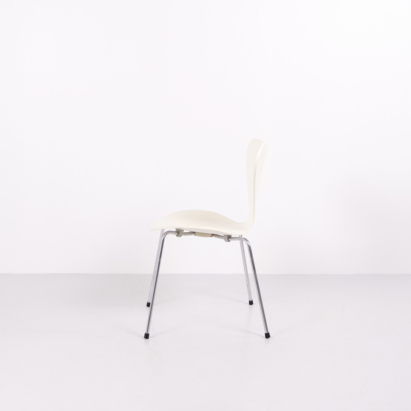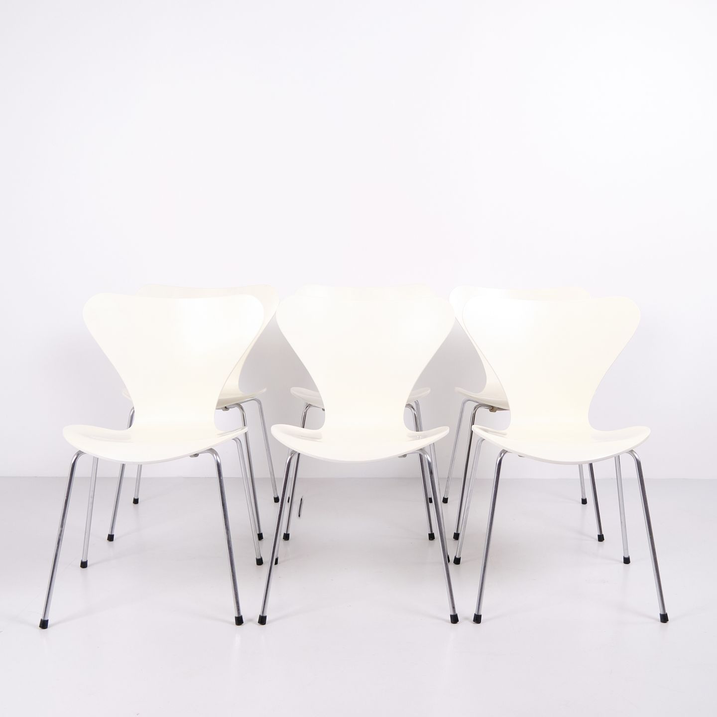 Set of 6 Series 7 chairs model 3107 designed by Arne Jacobsen for Fritz Hansen. The model was introduced in 1955 as a further development of the Ant chair from 1952. Crafted in pressure-moulded veneer with white lacquered finish and chrome-plated tubular steel frame. The distinctive seven-shaped silhouette made the model one of the most produced chairs in Danish design history. Model 3107 has been used in private homes, restaurants, offices and public interiors worldwide and is still produced by Fritz Hansen. Sold only as a complete set.