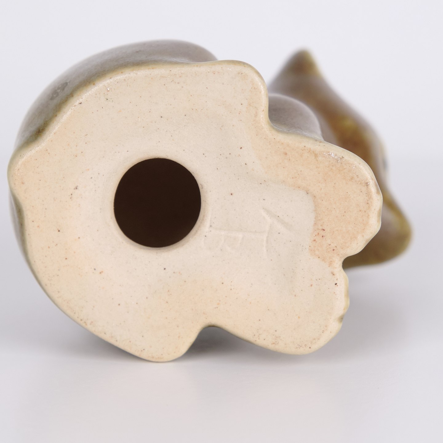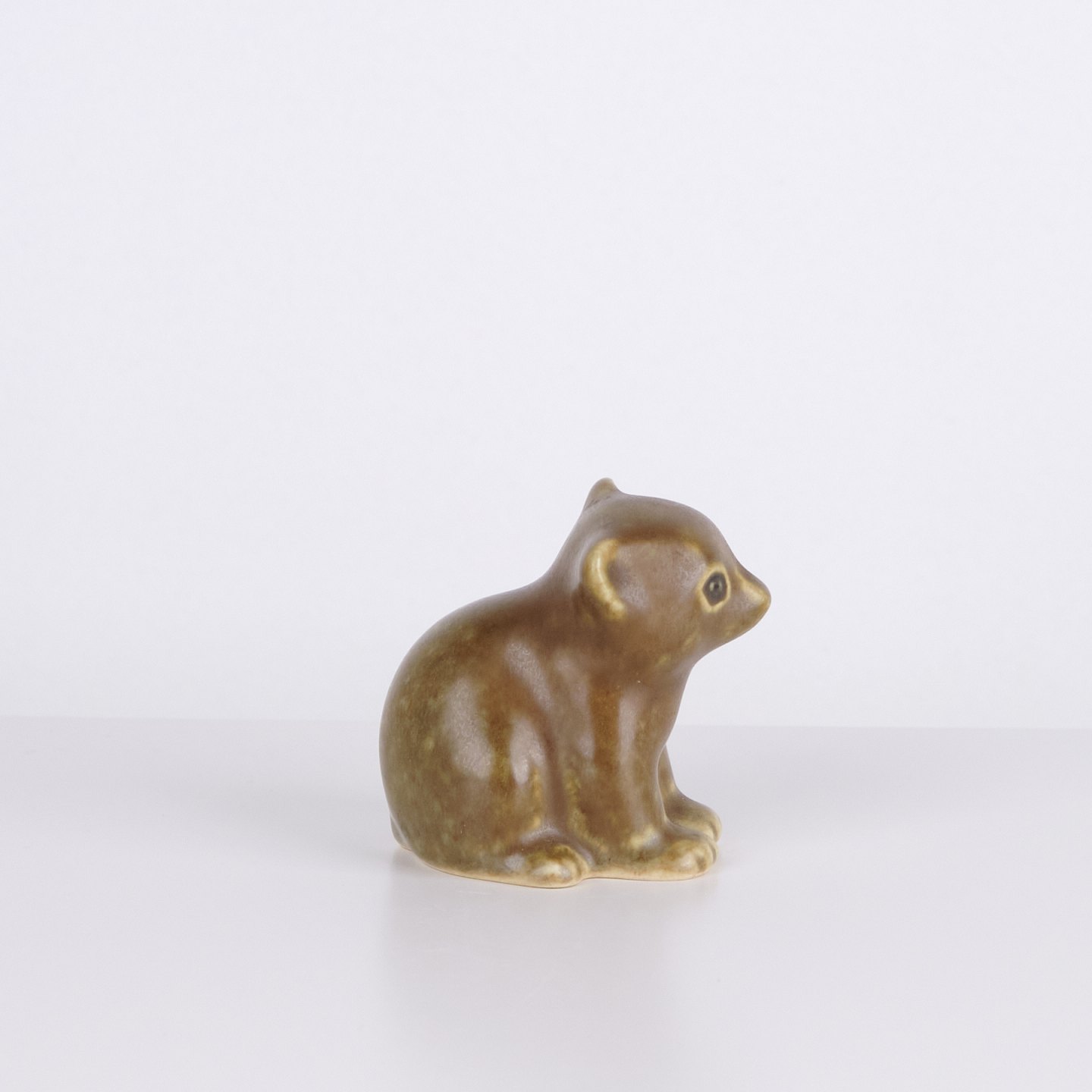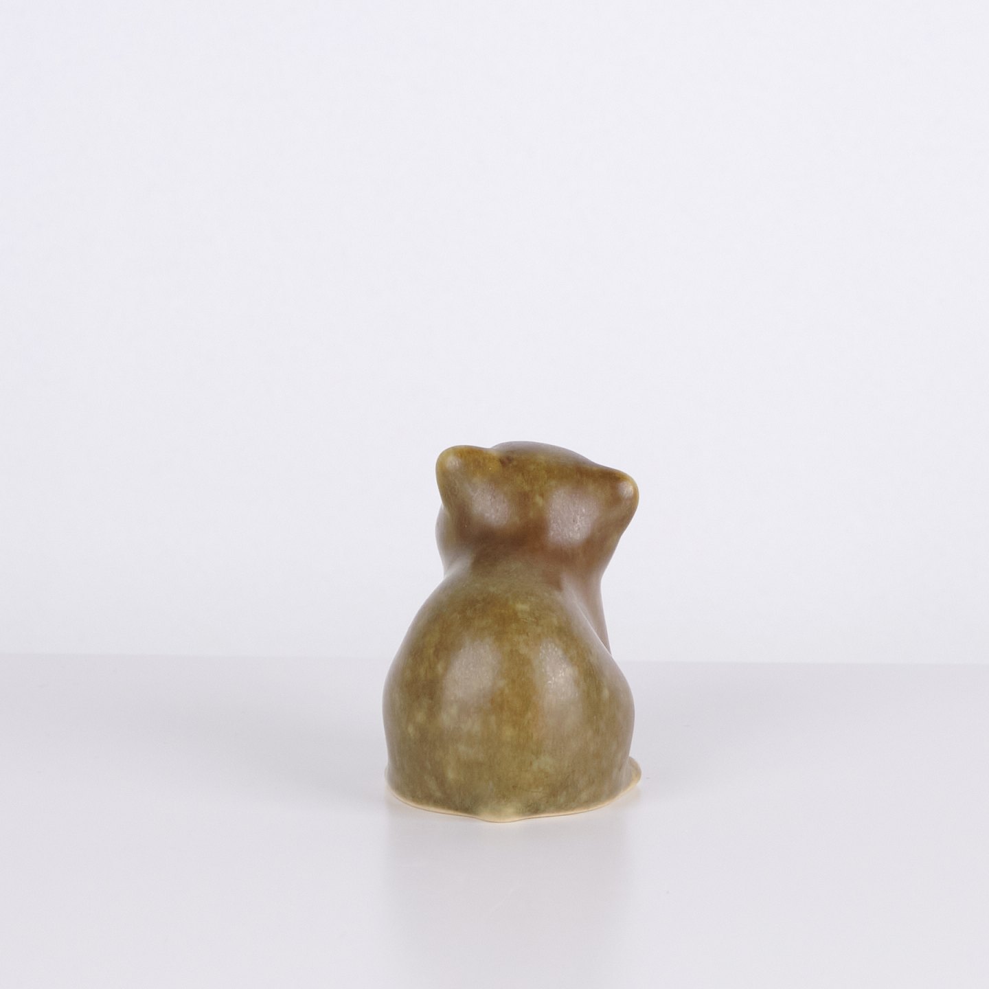 Cat figure by Knud Basse made in brown glazed ceramic. The model shows a seated cat with accentuated eyes and rounded body form.
