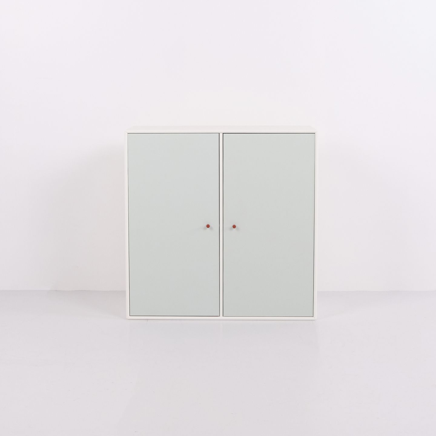 Montana cabinet module from the Montana System designed by Peter J. Lassen for Montana. Made of lacquered MDF with white корпус, two mint green doors and brown handles. Suitable as a wall cabinet, hallway unit or storage module. 2 pieces in stock.