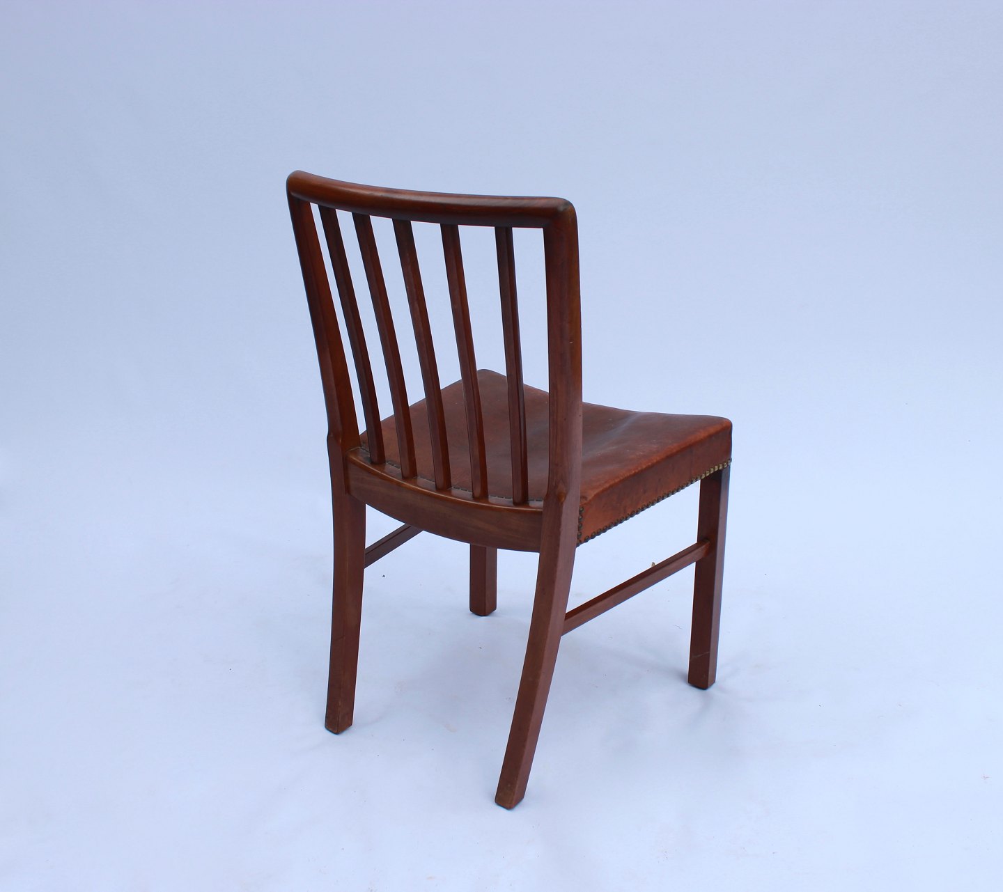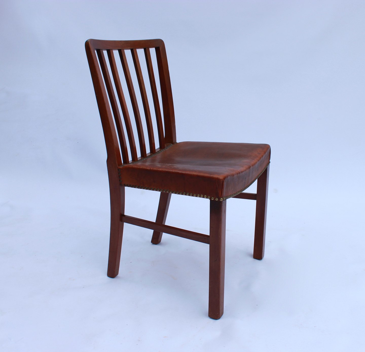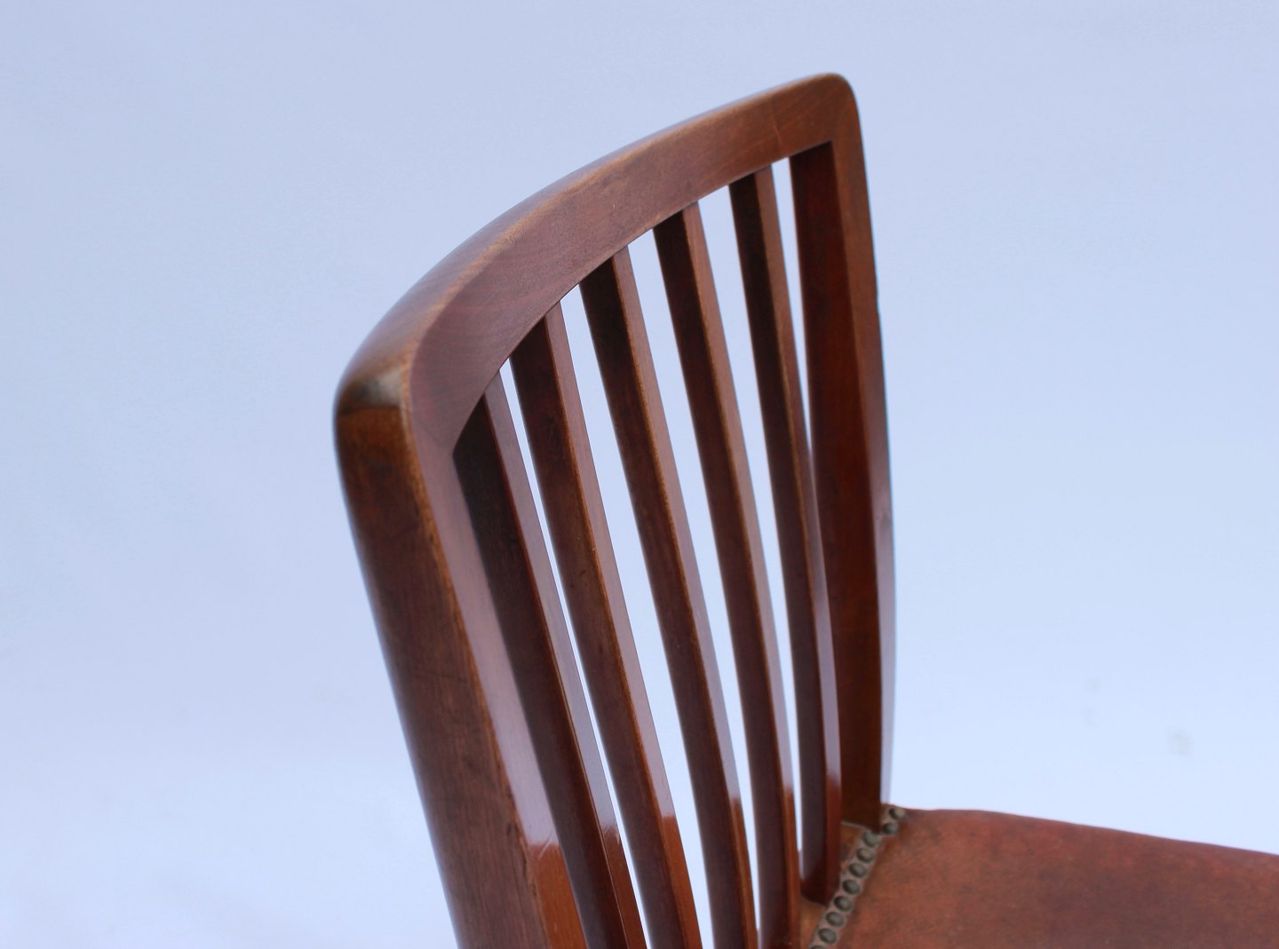 SoldSet of 6 dining chairs in light mahogany and originally upholstered with patinated leather by Fritz Hansen from the 1940s. The chairs are in great vintage condition.