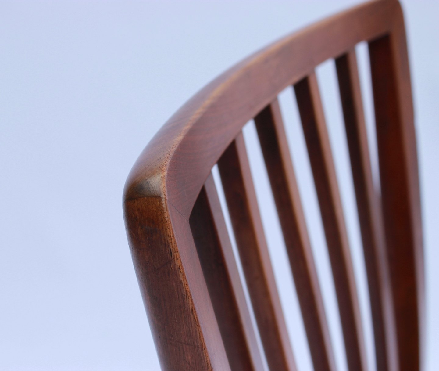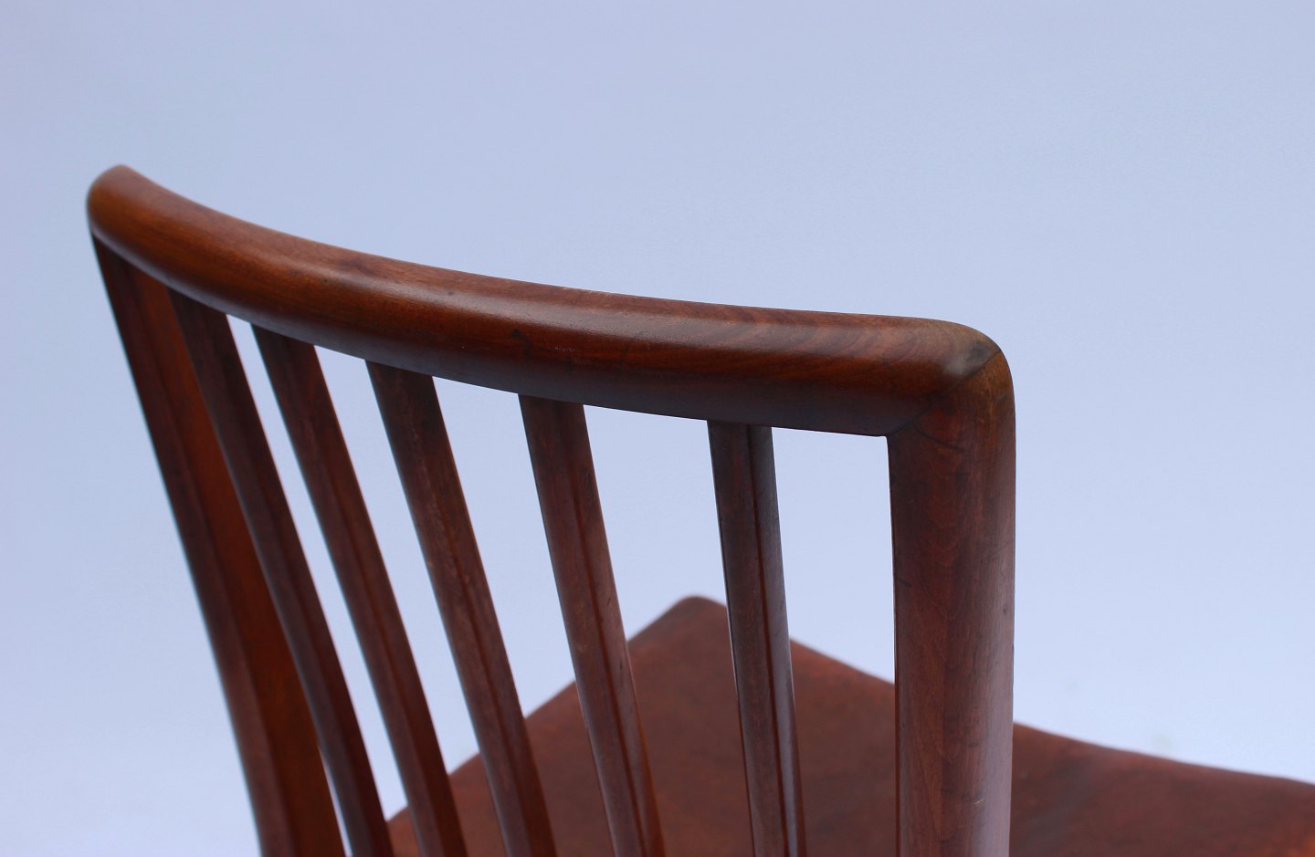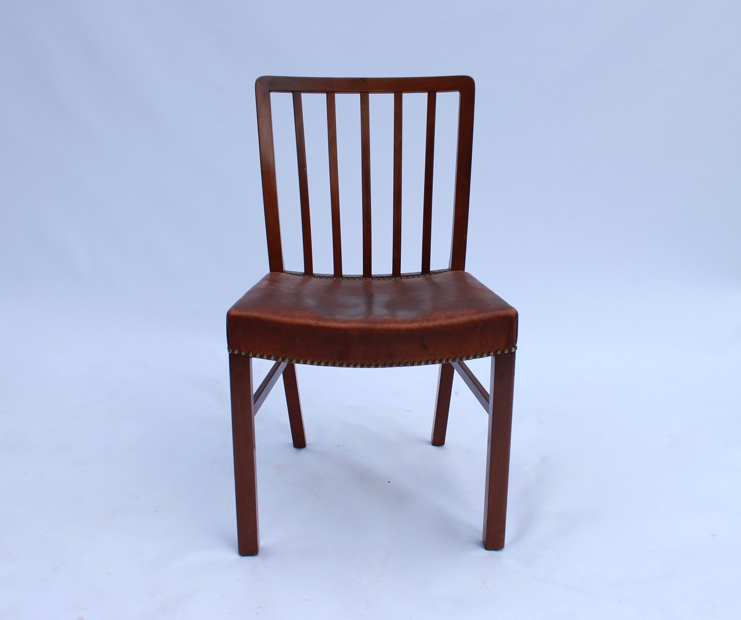 SoldSet of 6 dining chairs in light mahogany and originally upholstered with patinated leather by Fritz Hansen from the 1940s. The chairs are in great vintage condition.