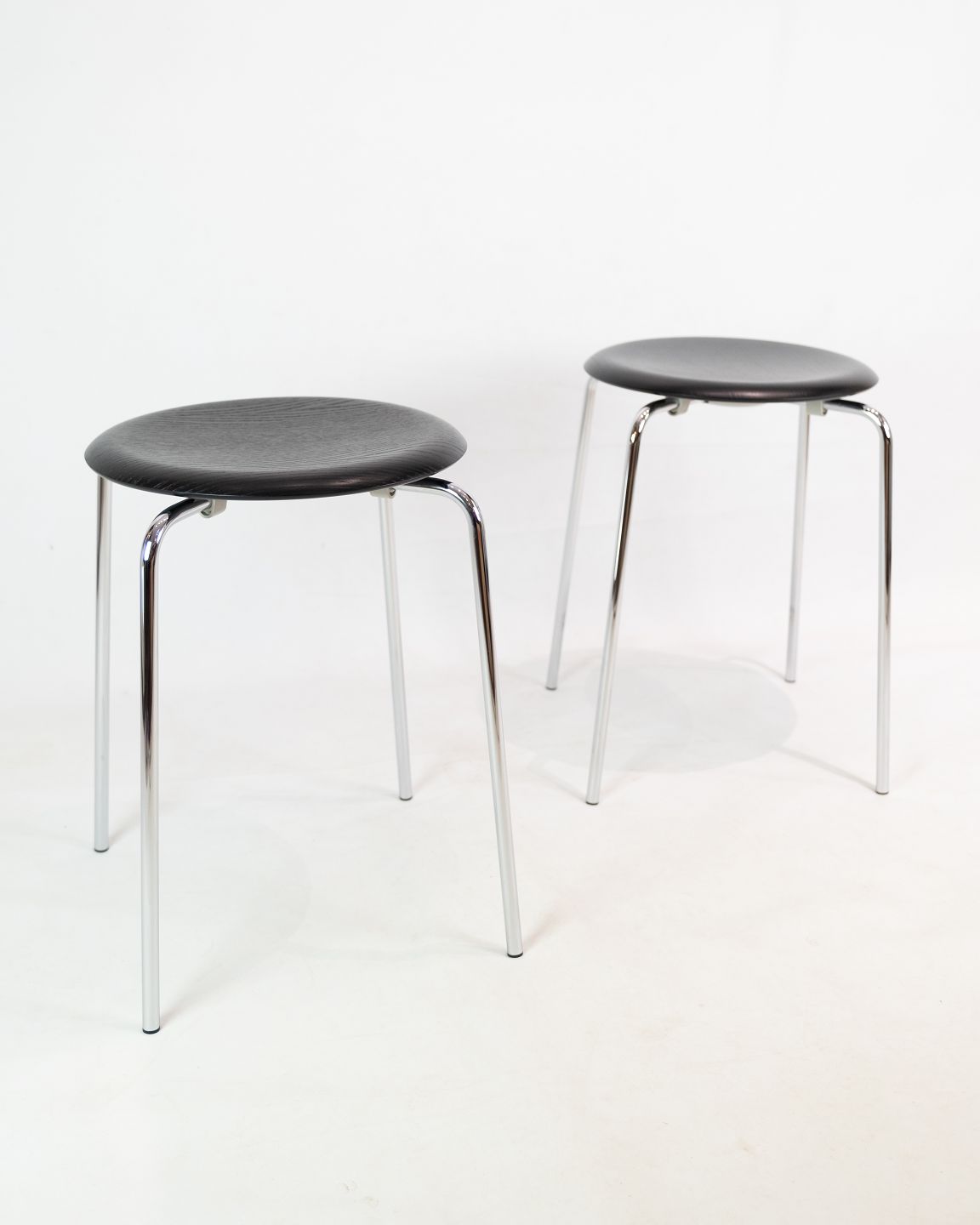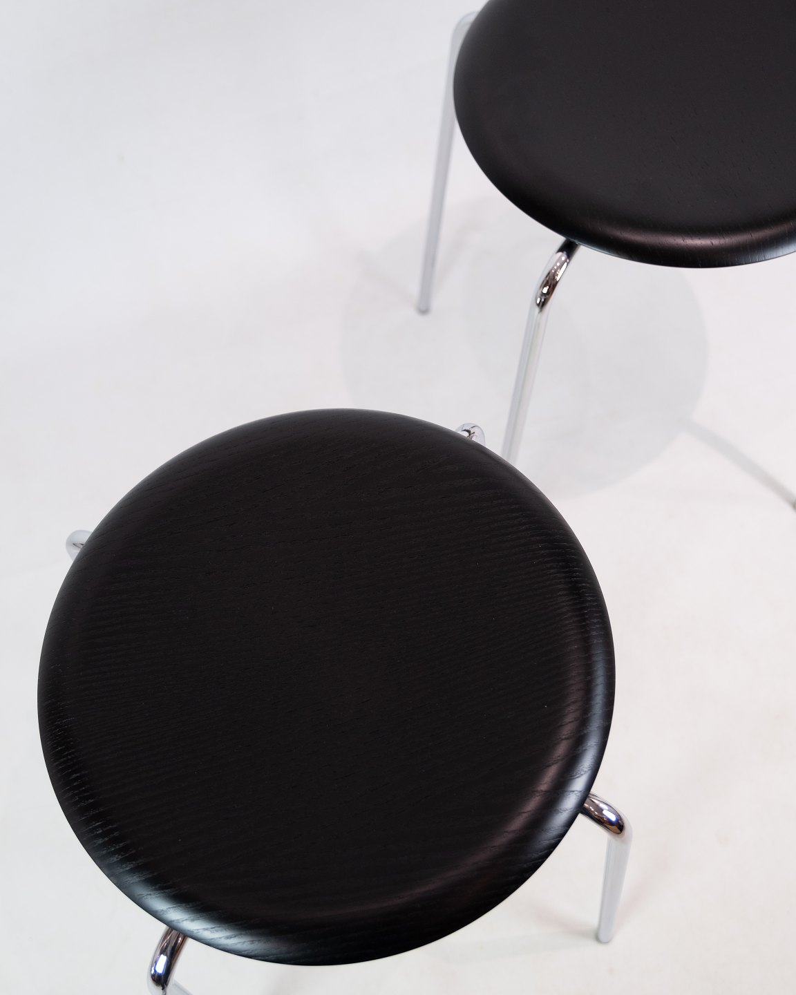 The stools have a frame of chrome-plated steel tube, which gives them a light and elegant appearance. The seat is made of black ash veneer, which adds warmth and contrast to the streamlined steel frame. The simple and functional shape makes these stools suitable for a wide range of interior styles and uses.