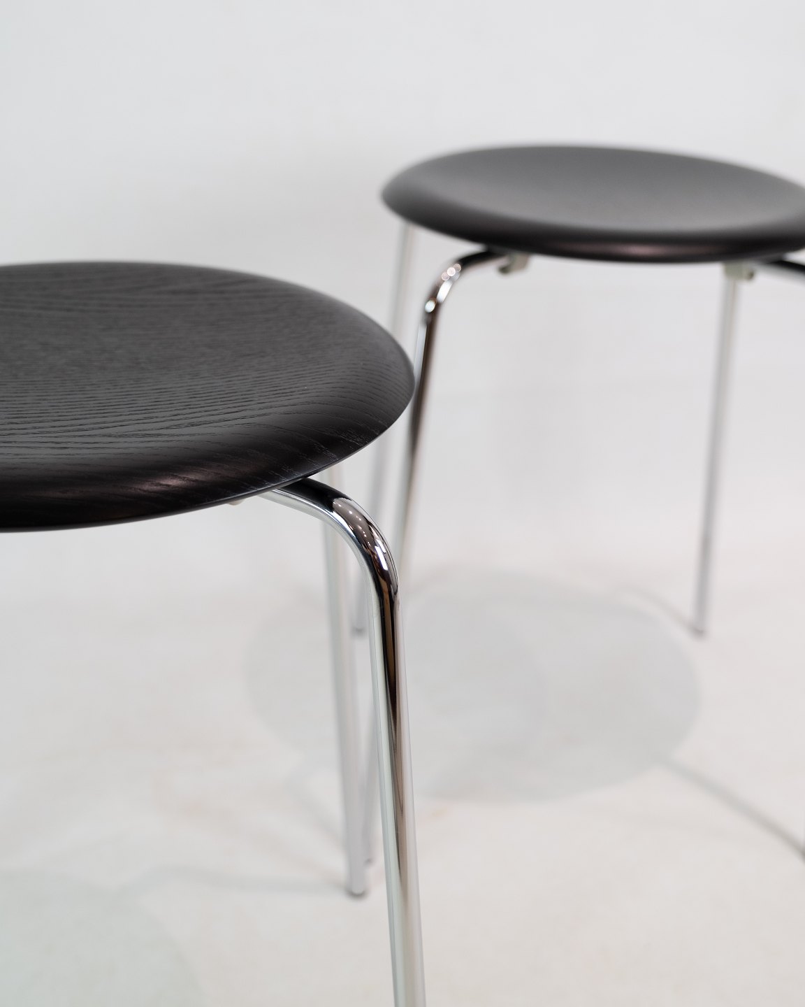 SoldThese two Dot stools are an iconic example of Danish design from the mid-20th century. Designed by legendary architect and furniture designer Arne Jacobsen and manufactured by Fritz Hansen, these stools have a distinctive minimalist aesthetic that is still popular today.
