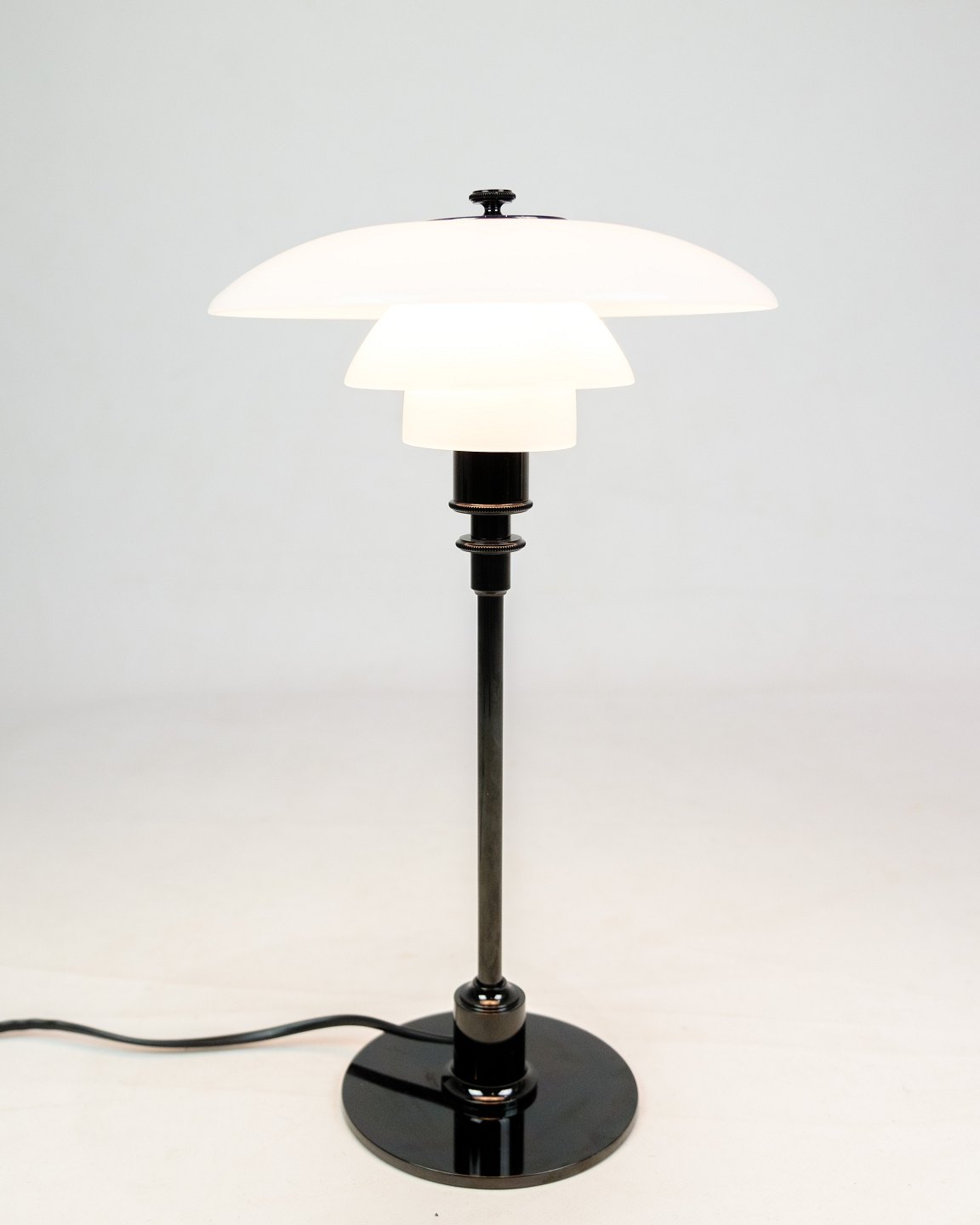 Experience the timeless elegance of Poul Henningsen's iconic design with this table lamp, model 3/2, in black metallized design, manufactured by Louis Poulsen. This lamp is not just a light source; it is a masterpiece of mid-century lighting design and Danish craftsmanship.