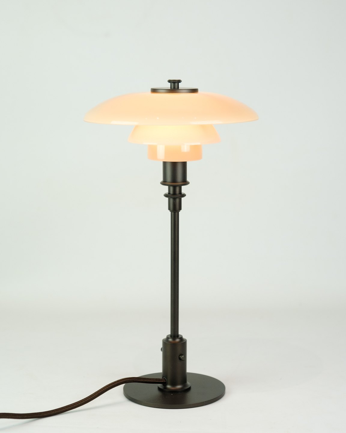 The exclusive PH 2/1 table lamp is a limited edition from Louis Poulsen, designed by Poul Henningsen. The lamp is equipped with mouth-blown, four-layer glass shades in a unique Dusty Terracotta color, which creates a warm and inviting atmosphere. The frame is made of lacquered, aged brass, which gives a refined and timeless expression.