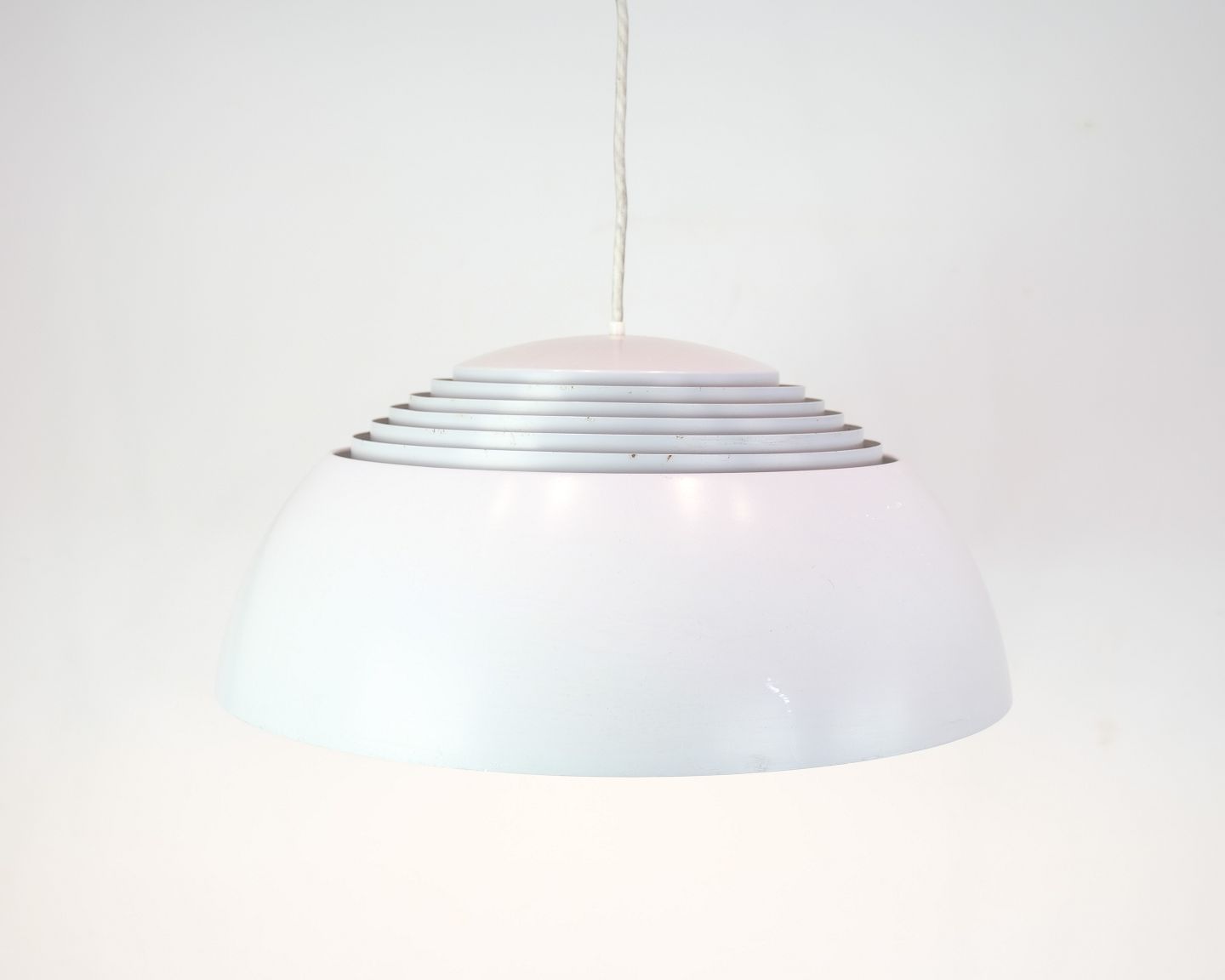 The AJ Royal pendant lamp was designed by Arne Jacobsen in 1957 as part of the overall design concept for the then SAS Royal Hotel in Copenhagen. Production was started shortly afterwards by Louis Poulsen, who continues to manufacture the lamp today. This version is in grey with a white cord.