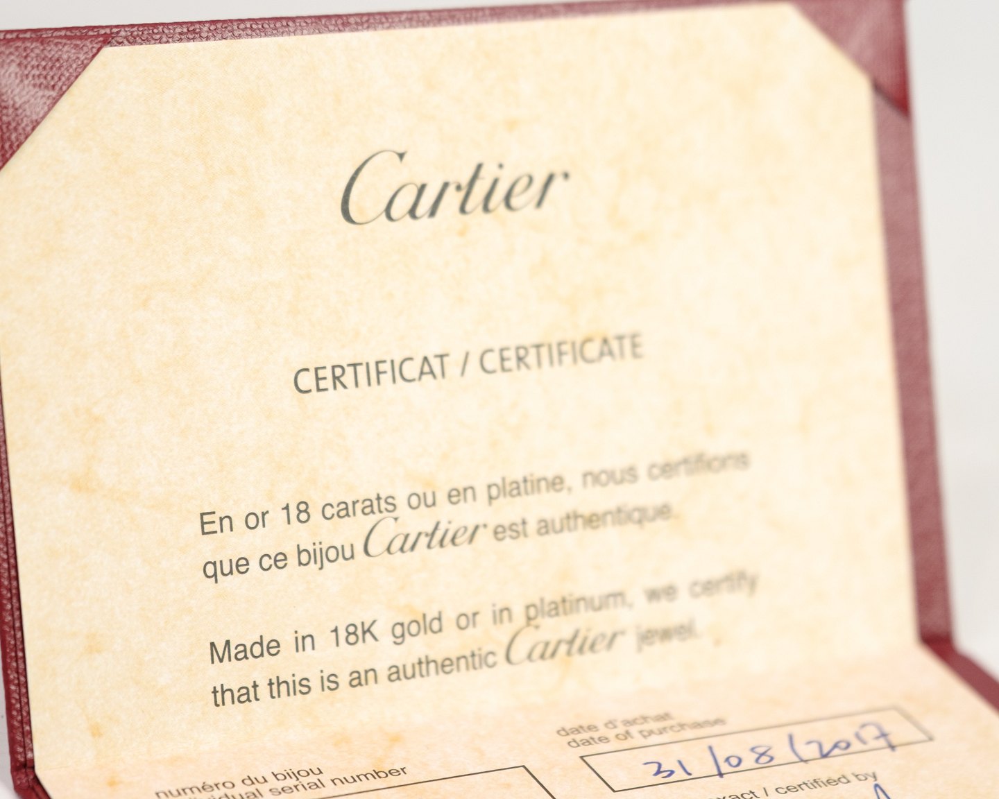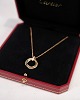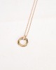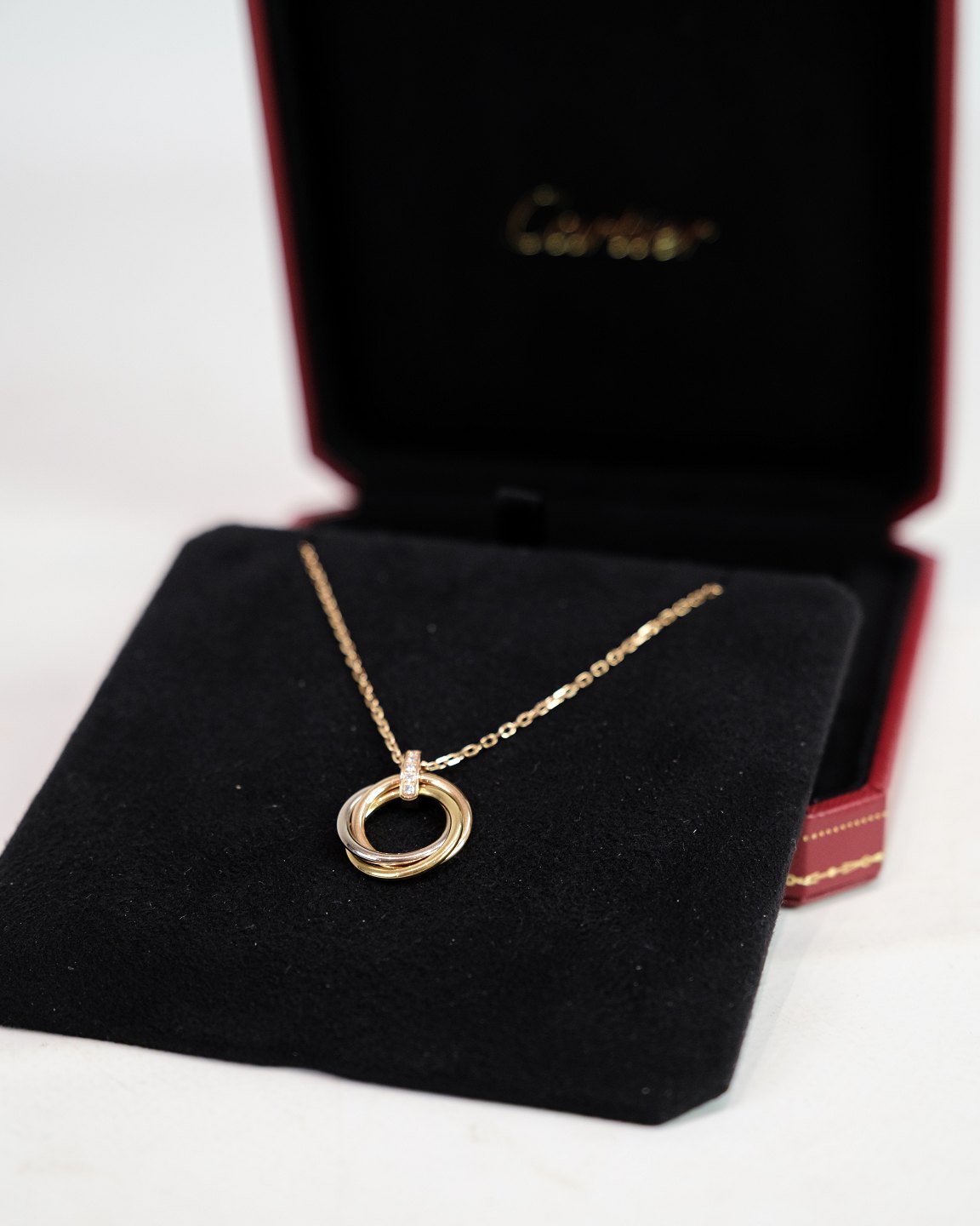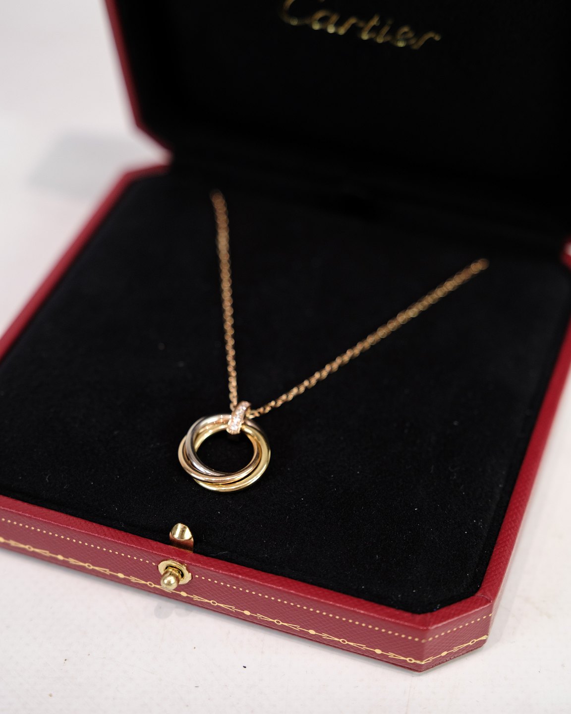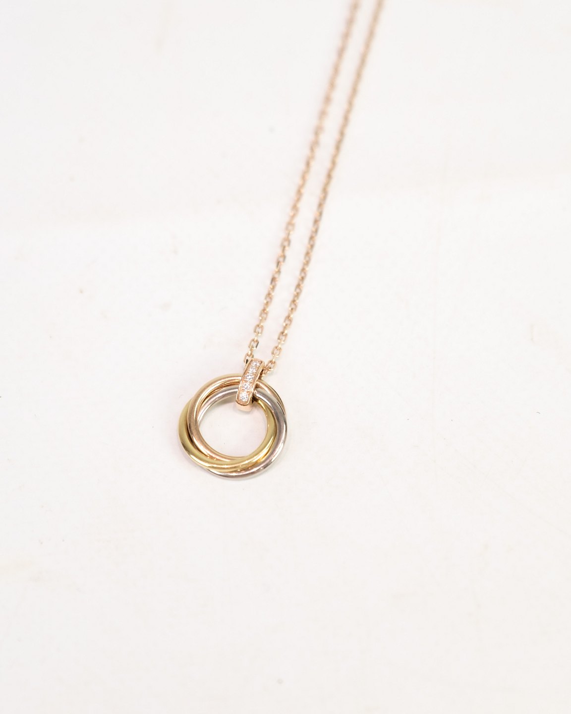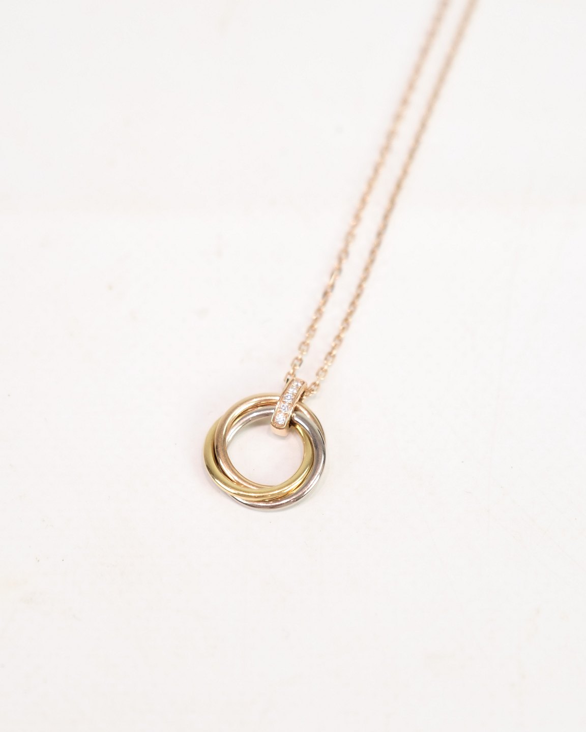 Necklace from Cartier, from the Trinity collection. The chain is made of 750 rose gold with a safety clasp and adorned with a pendant consisting of three intertwined rings in white gold, rose gold and yellow gold - a classic Cartier signature.