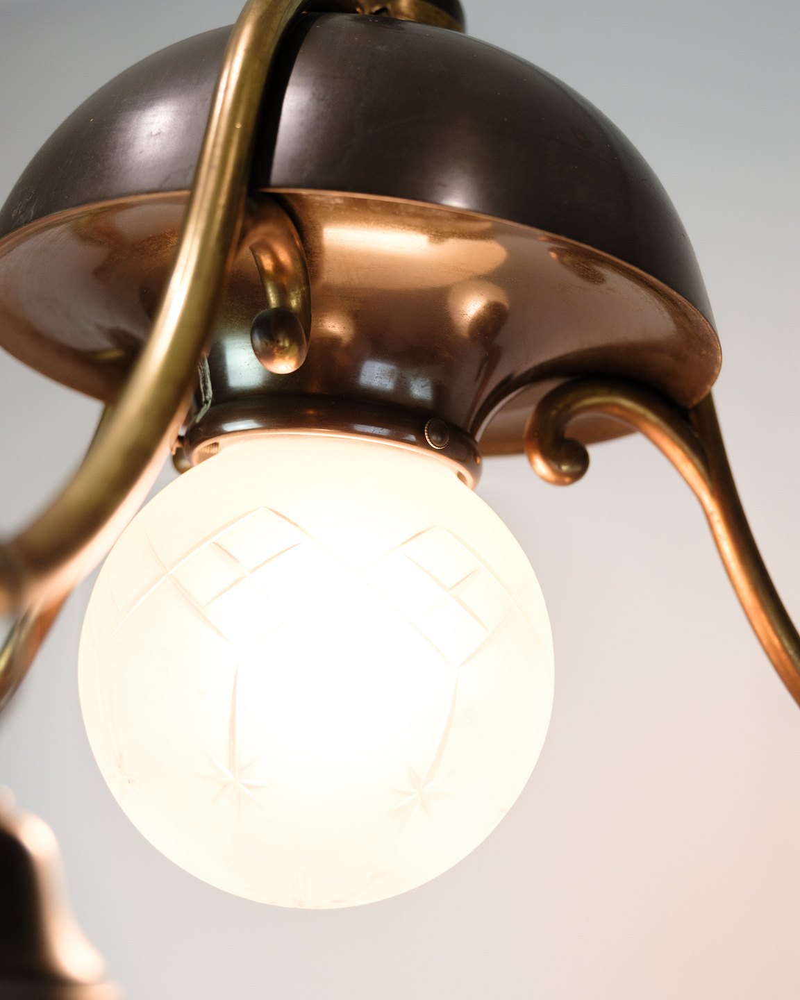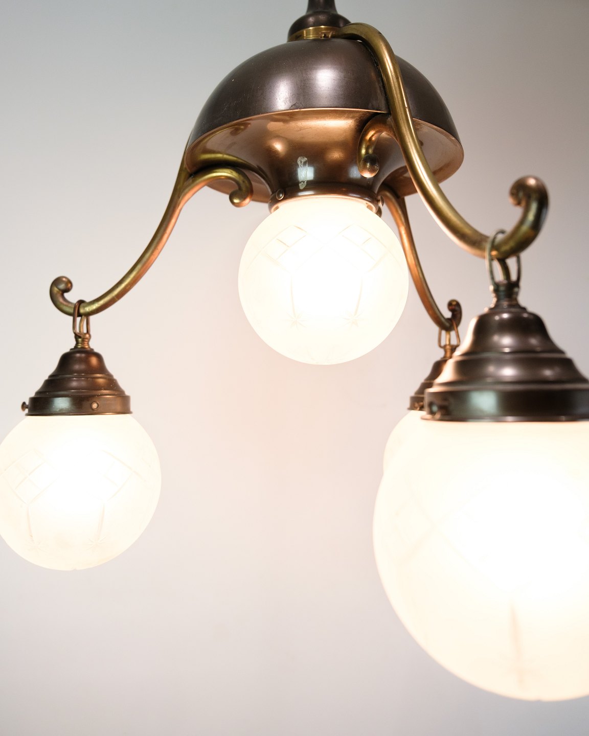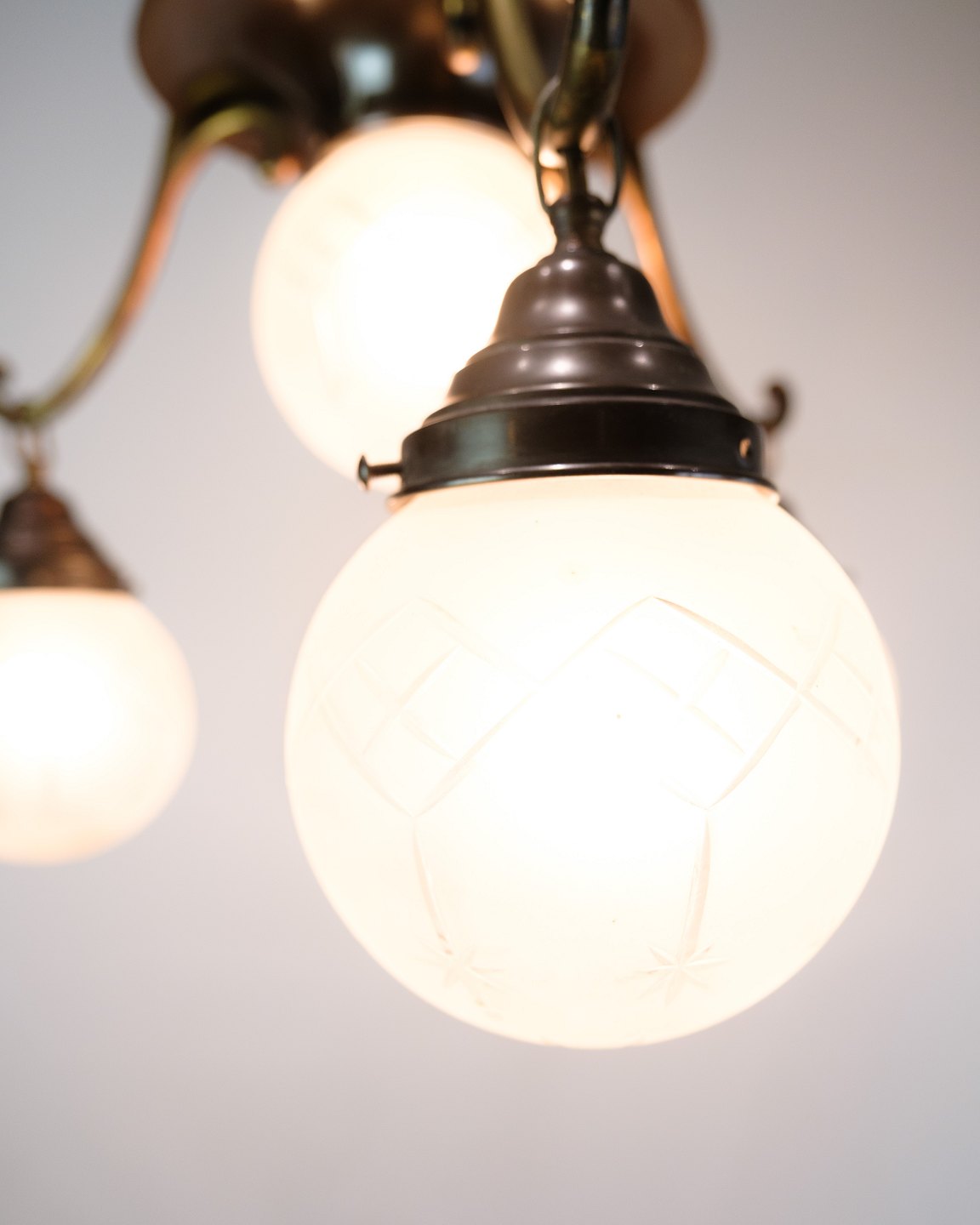 Sold3-armed Art Nouveau chandelier from the 1930s in burnished brass with opal glass balls. Classic ceiling lamp with decorative elegance.