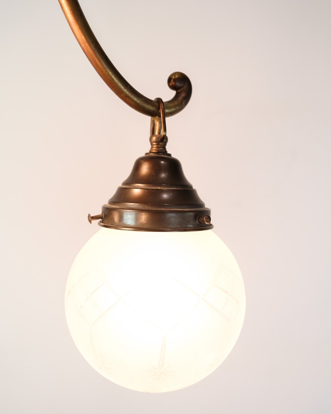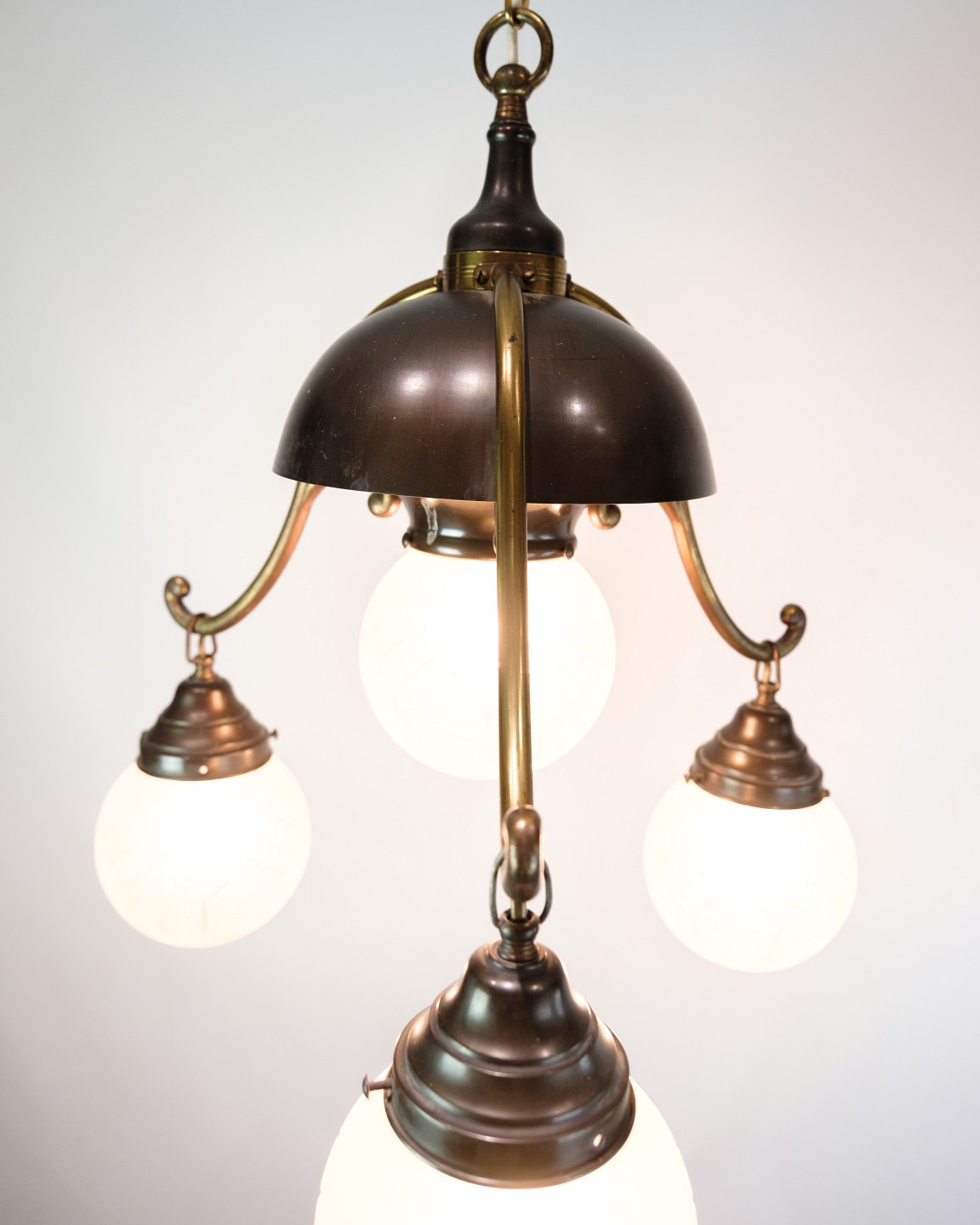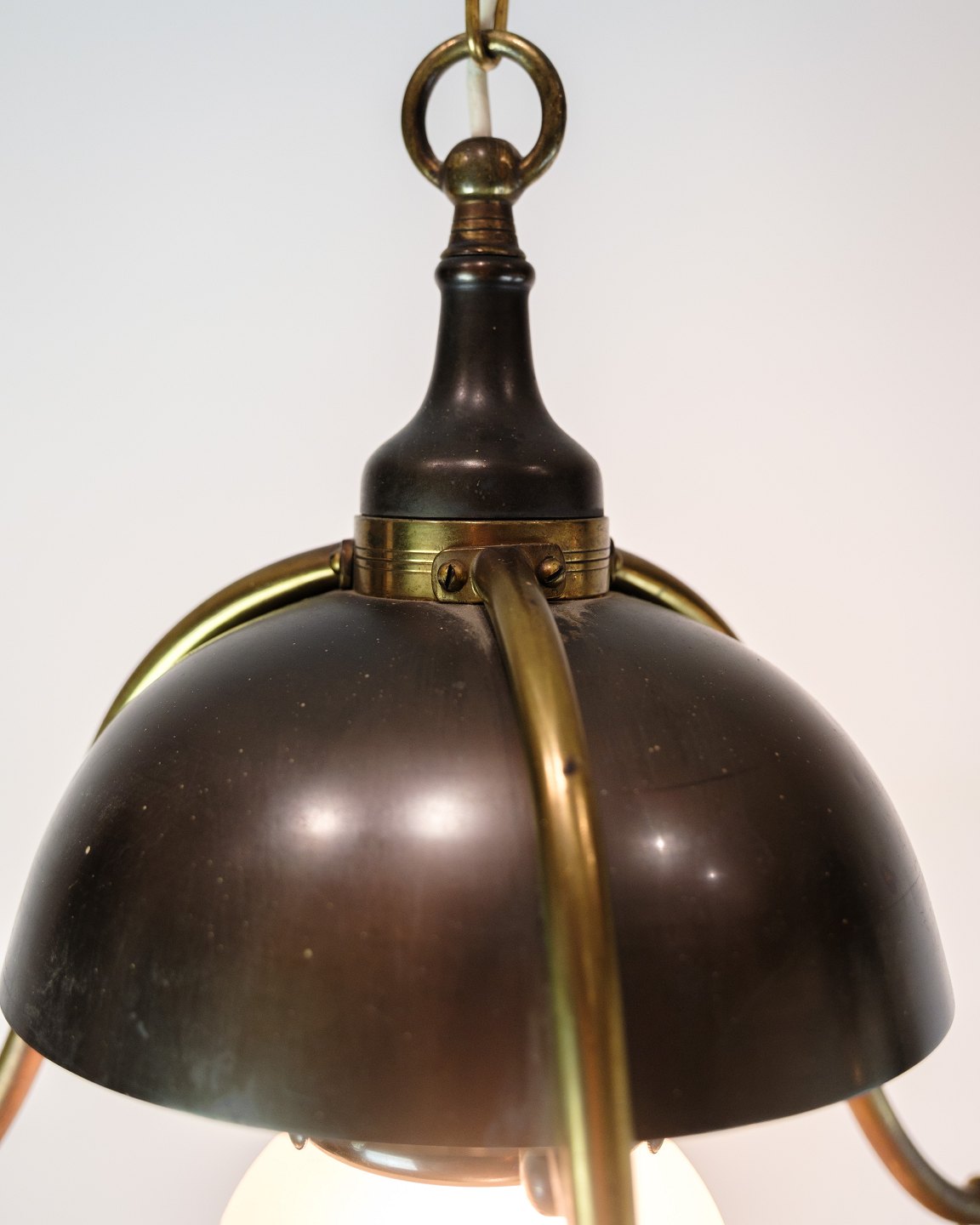 Sold3-armed Art Nouveau chandelier from the 1930s in burnished brass with opal glass balls. Classic ceiling lamp with decorative elegance.