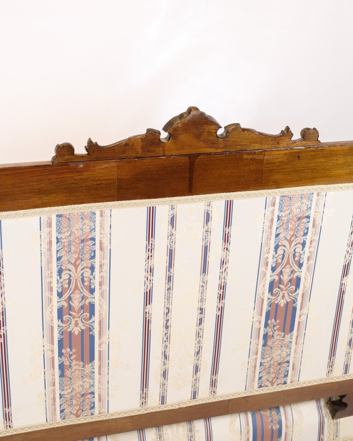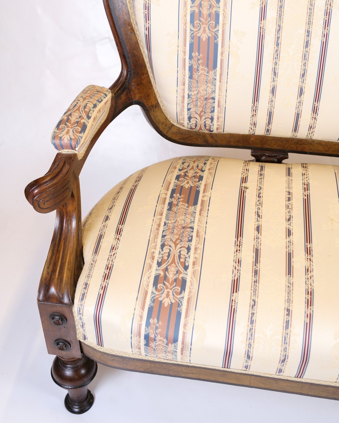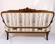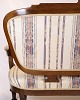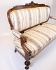 Antique 3-seater sofa in Klunke style from the 1890s. Walnut with turned legs and striped upholstery. Classic furniture from the late 19th century.