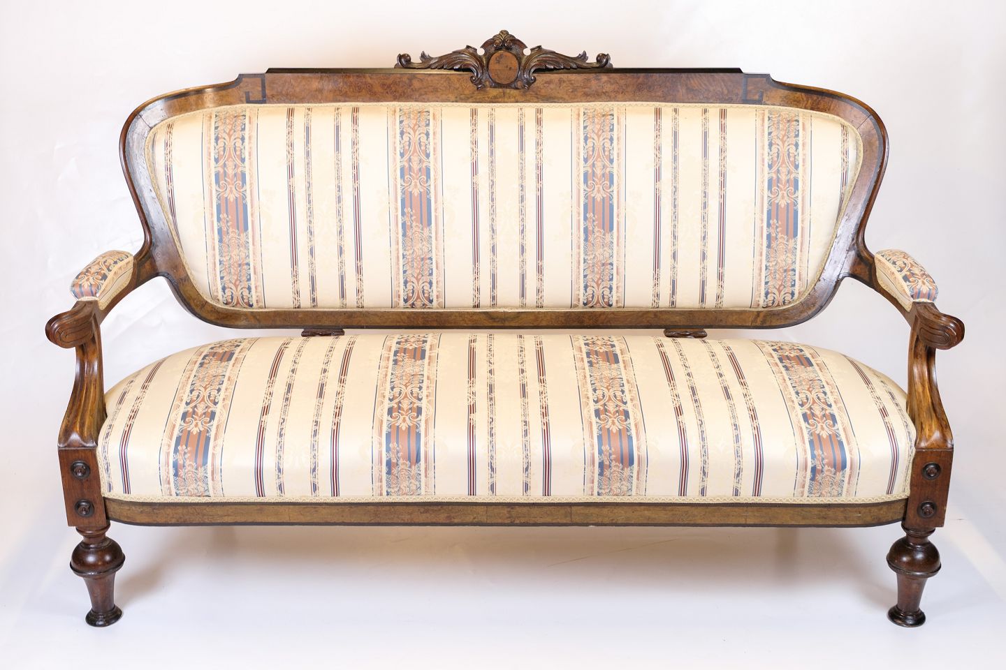 Antique 3-Seater Sofa - Klunke Style - Striped Upholstery - Walnut - Turned Legs - 1890s