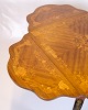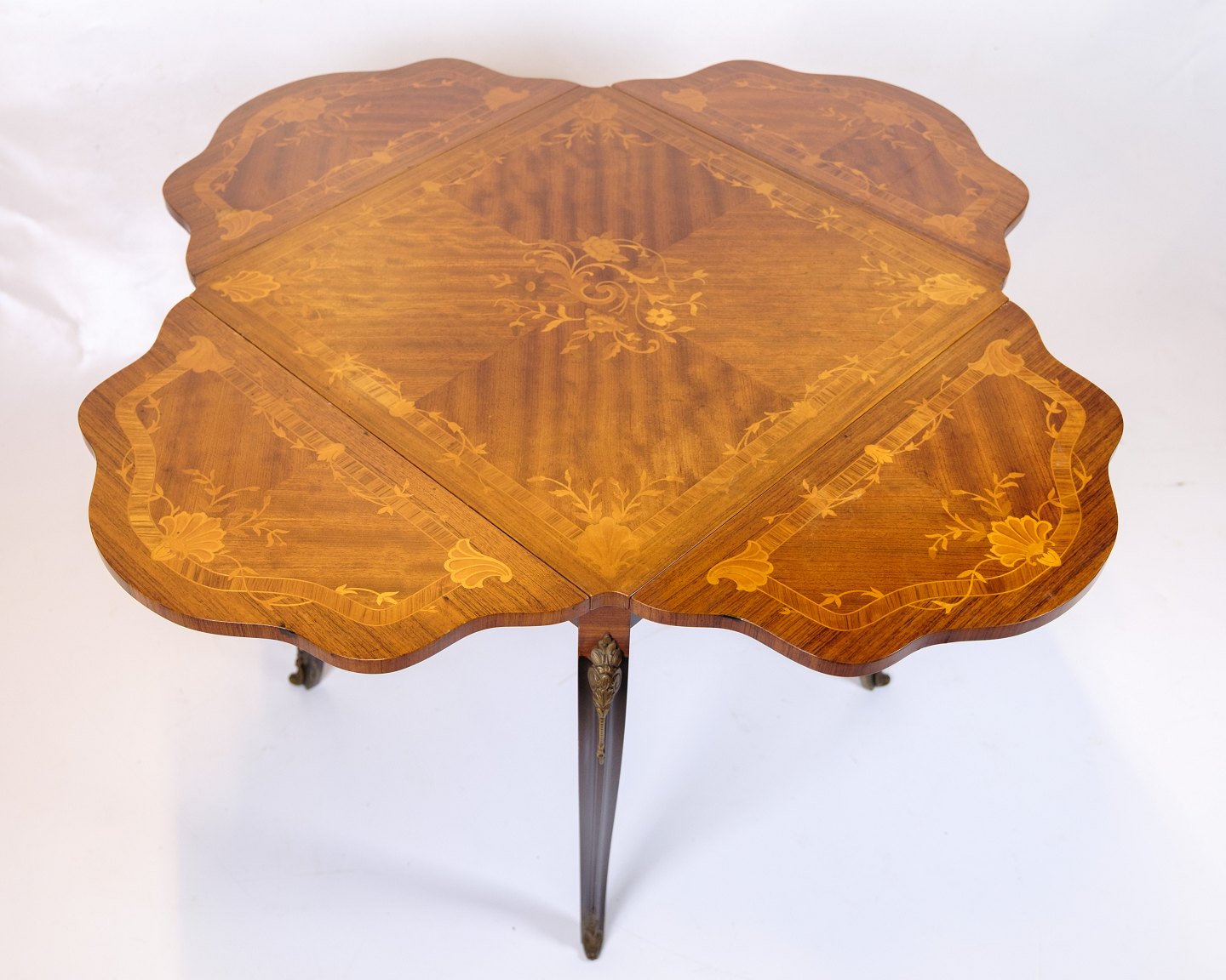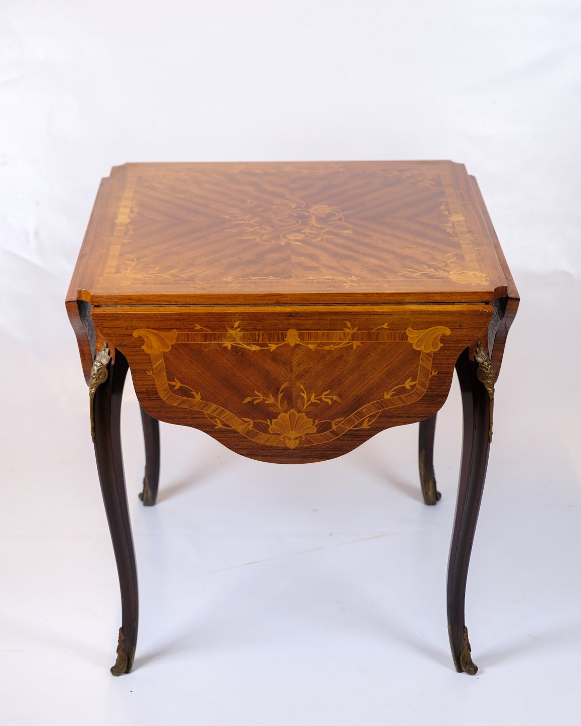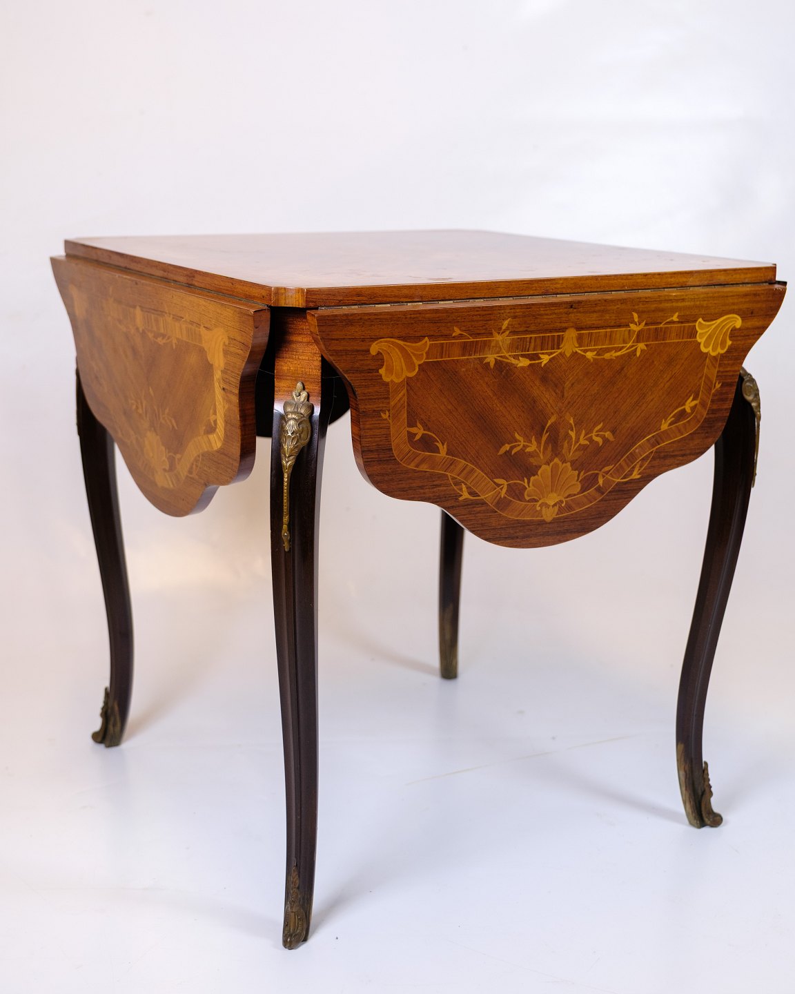 Antique rococo style sofa or side table from around 1900. The table is made of mahogany with beautiful rosewood inlay details. It is equipped with four 23 cm flaps that can be folded out, so that the table reaches a diameter of 100 cm.
