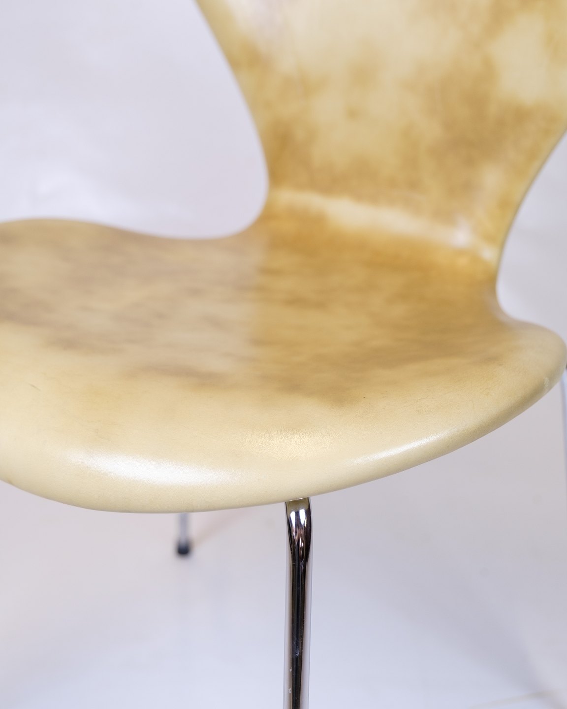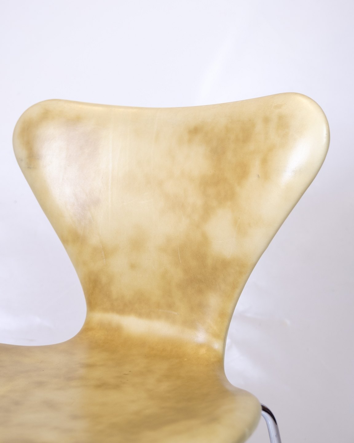 Set of eight Syver chairs, model 3107, designed by Arne Jacobsen in 1955 and produced by Fritz Hansen. The chairs are upholstered in beautifully patinated natural-colored leather, which gives each chair its own unique expression. The frame is made of chrome steel.