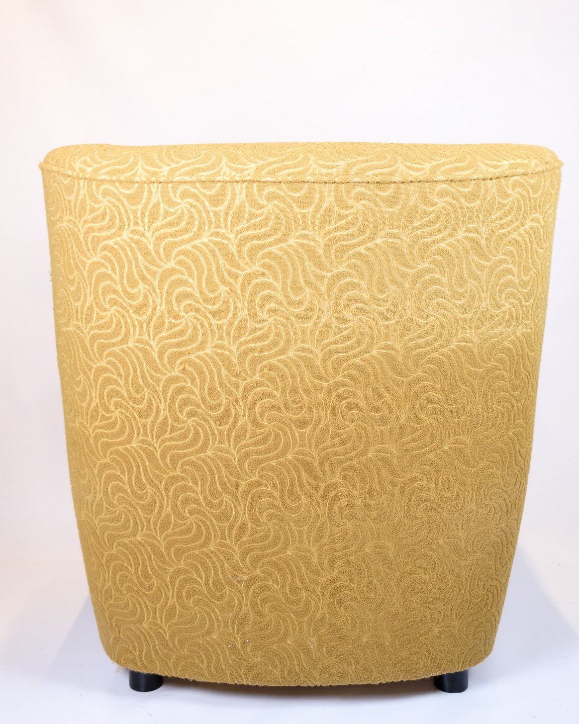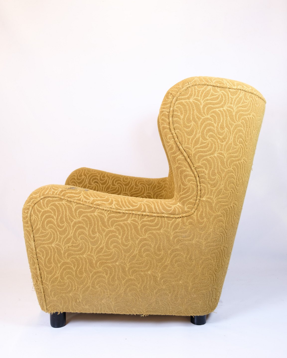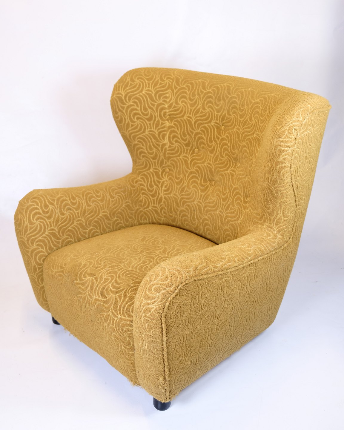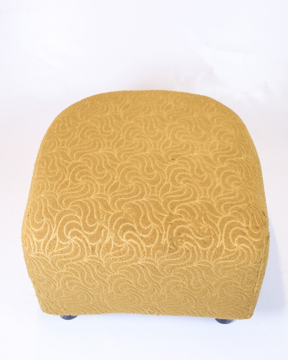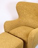 Armchair with ottoman from the 1940s. Upholstered in patterned yellow fabric with black legs. Classic design with high comfort.