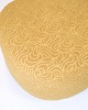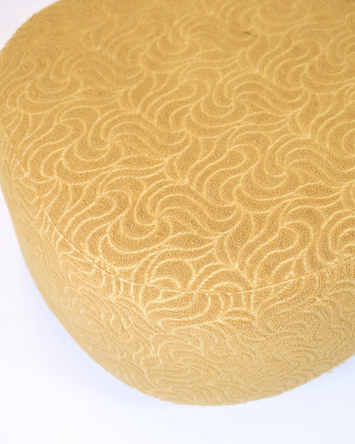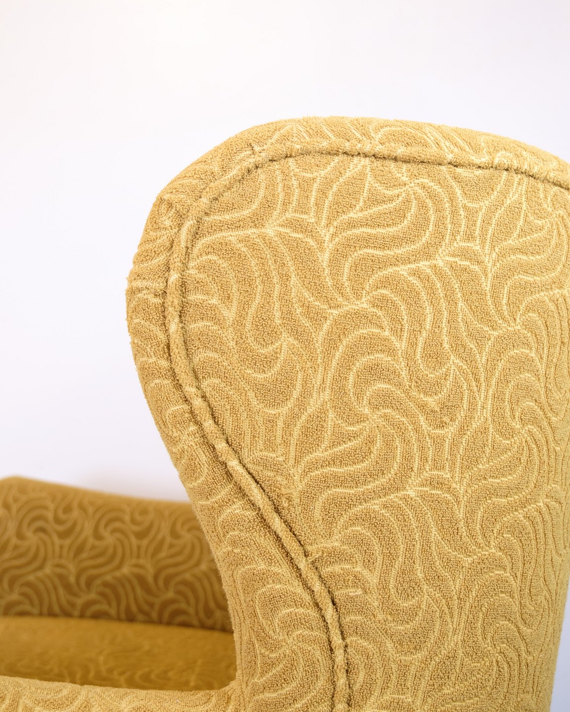 — Materials: Upholstered in patterned yellow fabric, black legs
