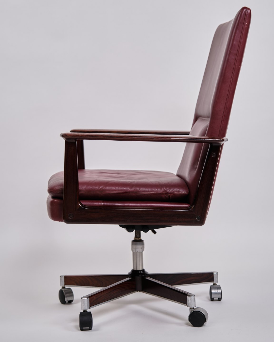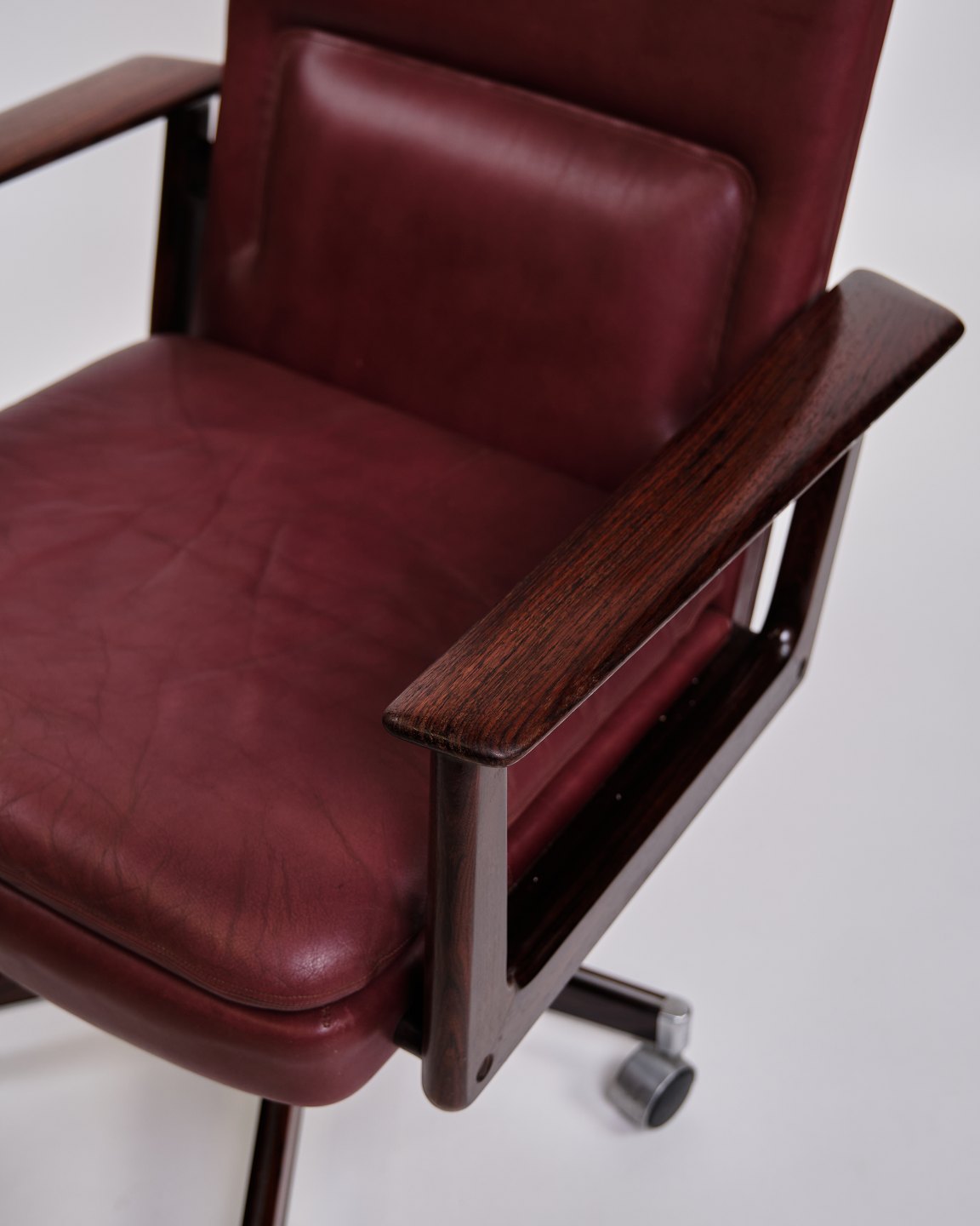 Arne Vodder office chair, model 419. Rosewood and burgundy leather. Sibast, 1960s. H: 104.5 cm, W: 71 cm, D: 50 cm, SH: 50 cm. Classic Danish design.