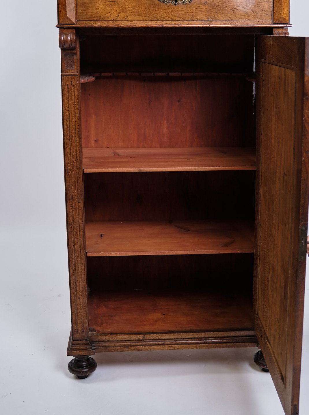 Antique mahogany cabinet from around 1880 with decoration and round legs. H: 187.5 cm, W: 73 cm, D: 49 cm. Classic Danish joinery.