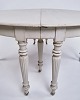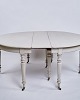 Gustavian round dining table from the 1780s. Grey painted with brass wheels. With 1 leaf of 30 cm and 4 of 60 cm.