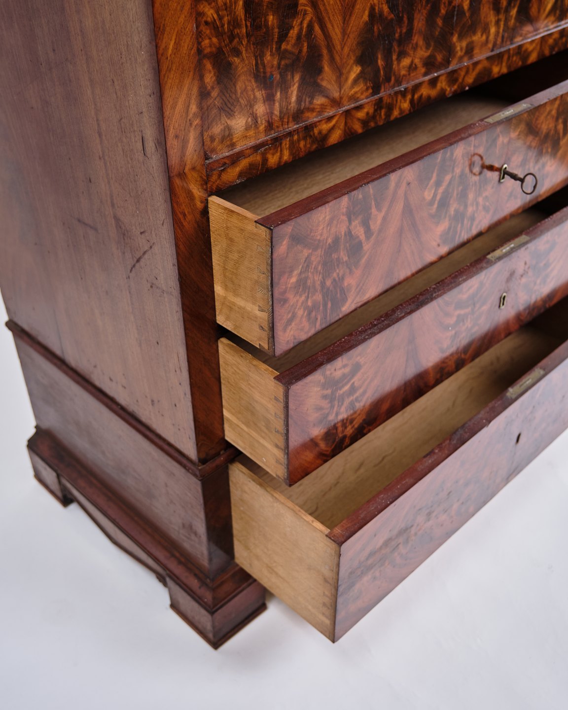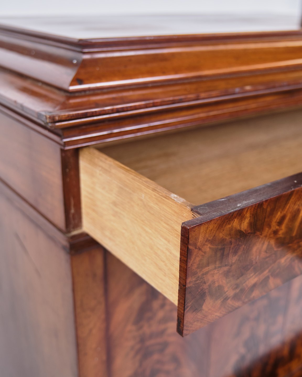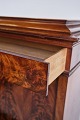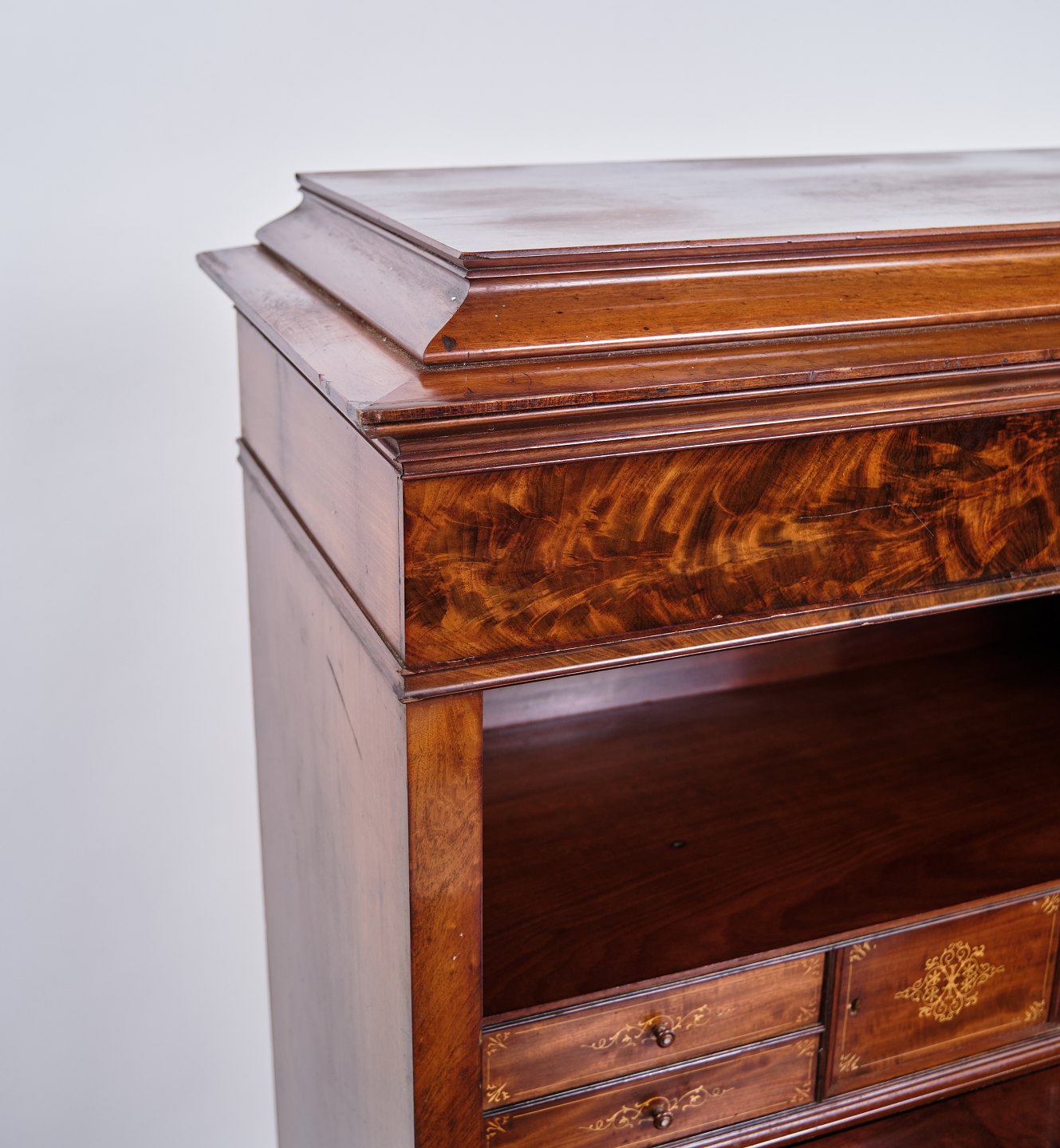 Antique chiffonier from the 1840s. Mahogany with inlay, flame structure and 4 drawers. H: 150 cm, W: 101 cm, D: 52 cm. Classic joinery.