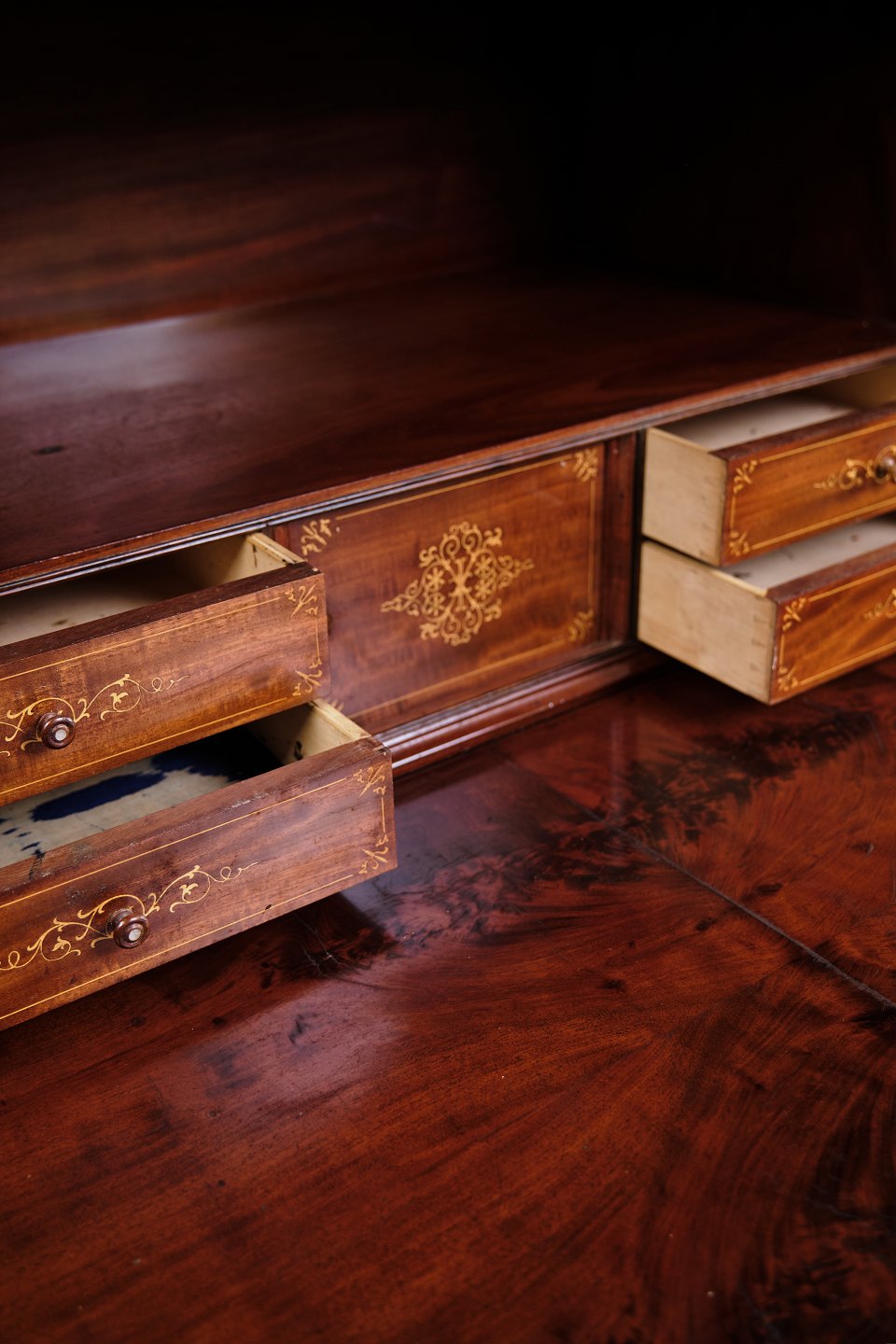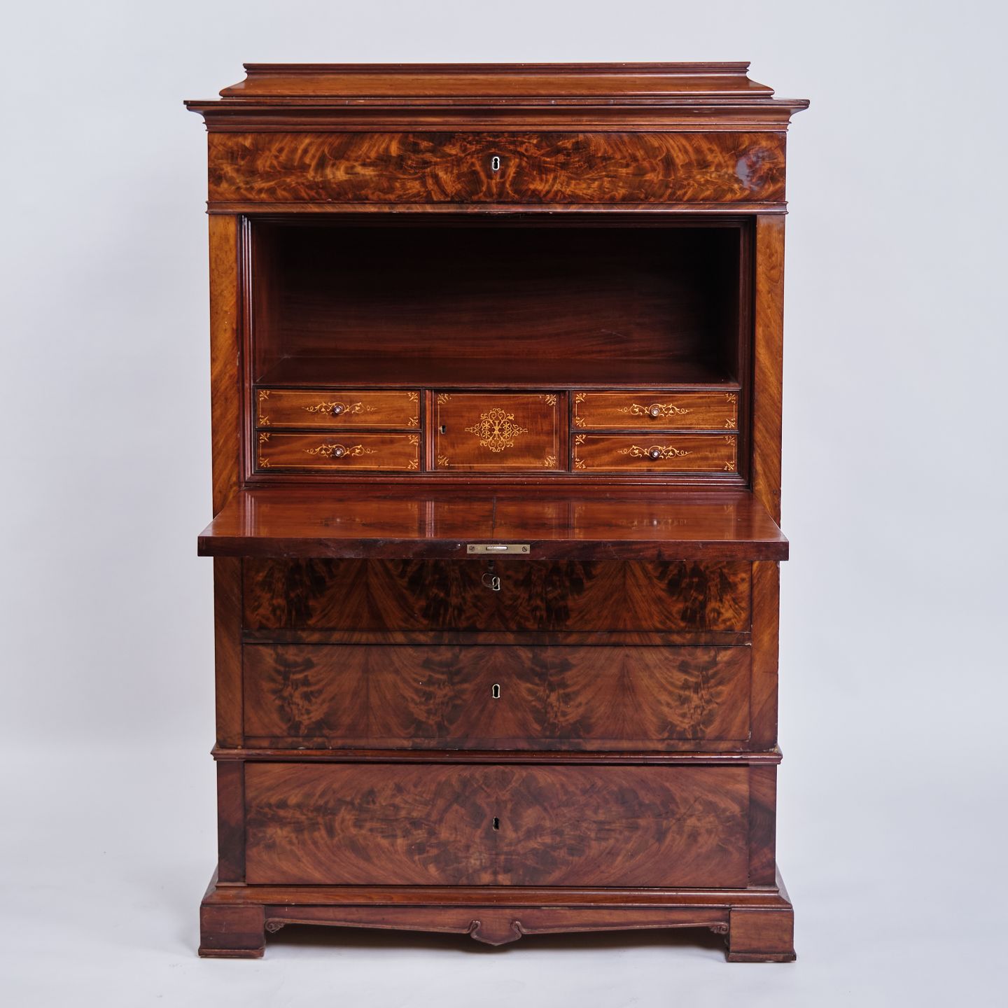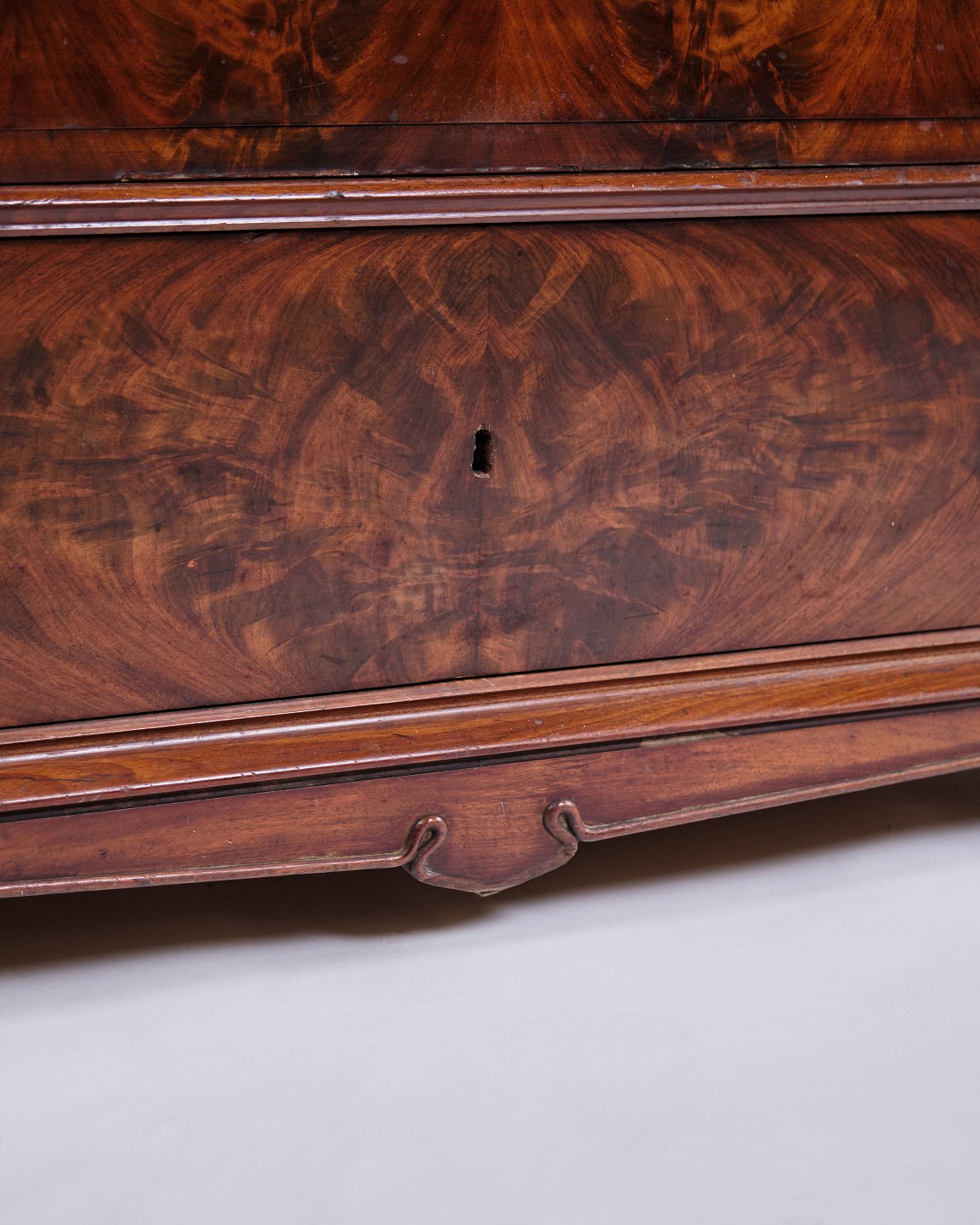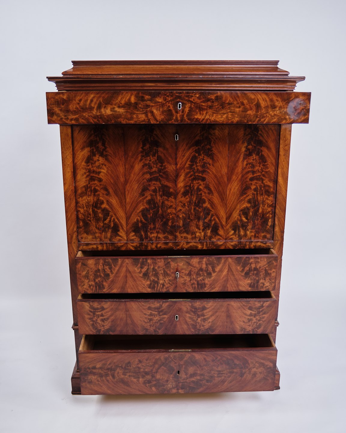 Antique chiffonier from the 1840s. Mahogany with inlay, flame structure and 4 drawers. H: 150 cm, W: 101 cm, D: 52 cm. Classic joinery.