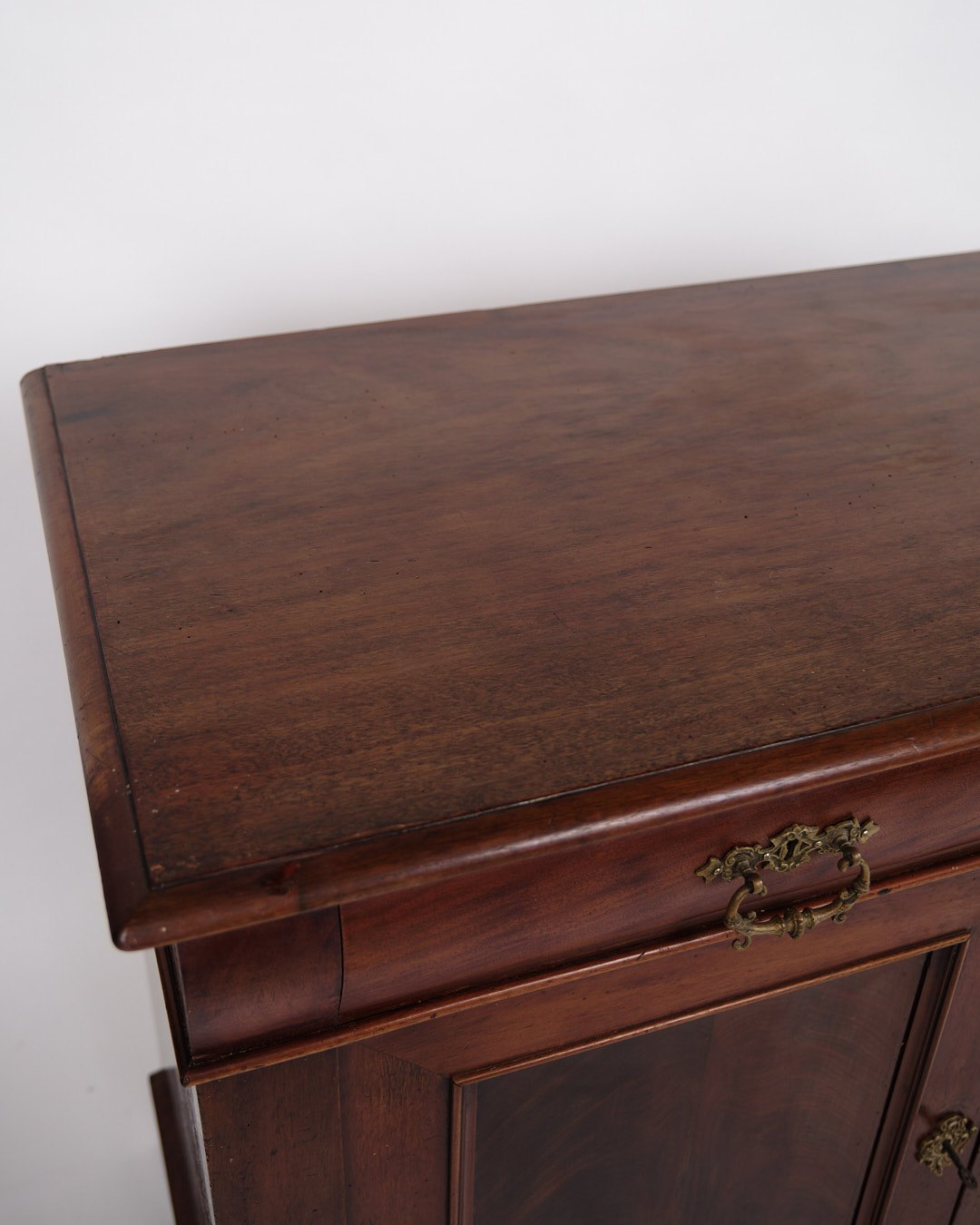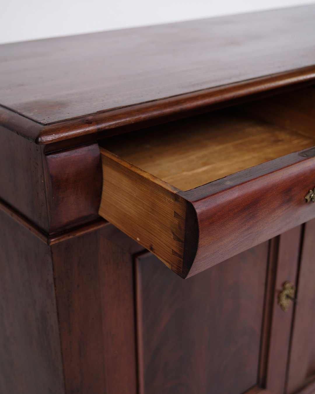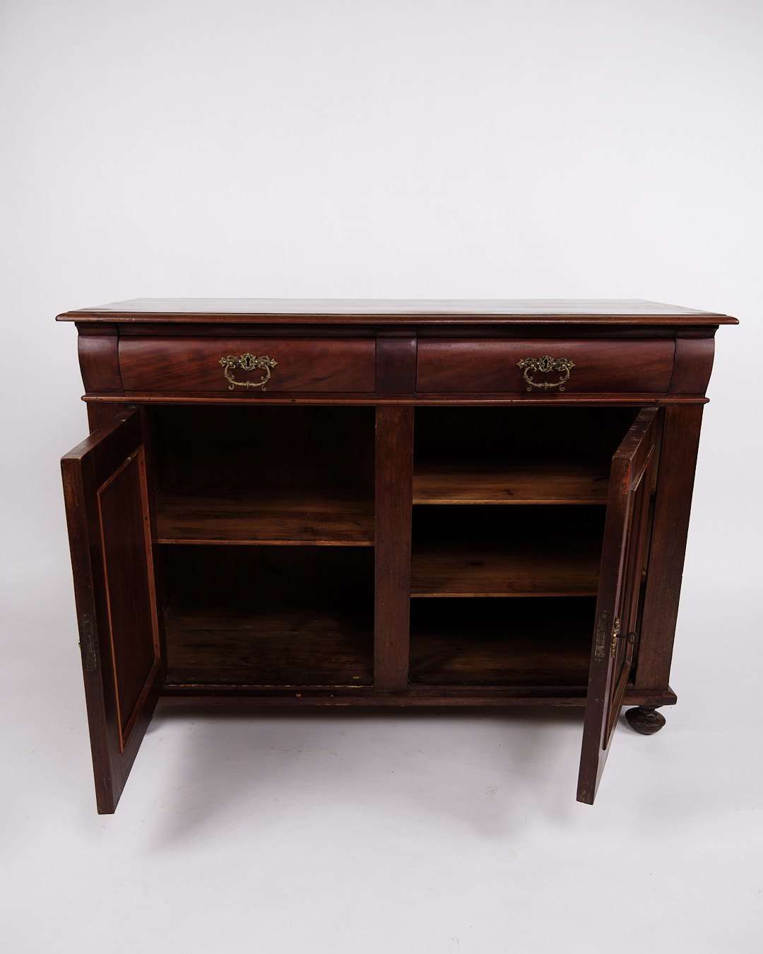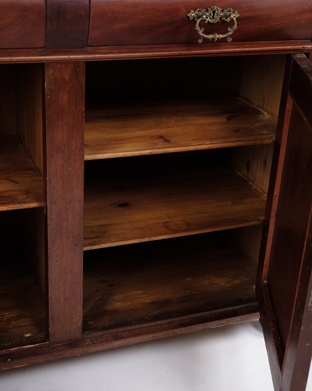 low antique sideboard from the 1880s, made of hand-polished mahogany. The sideboard is furnished with fixed shelves and features period details that testify to the solid joinery craftsmanship of the 19th century.