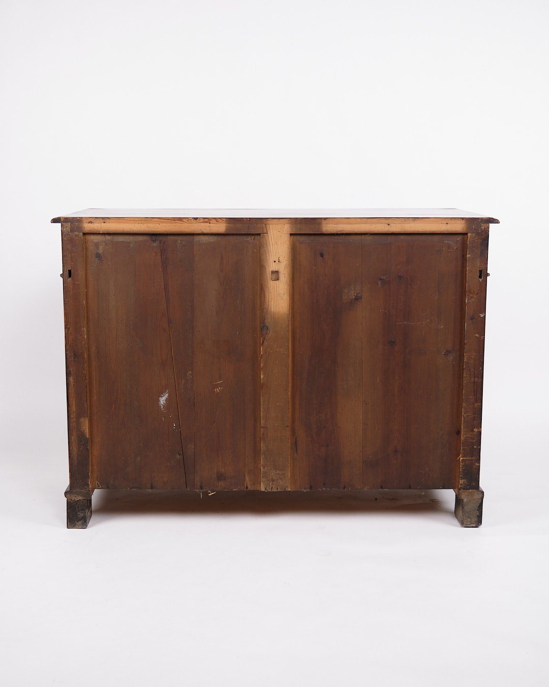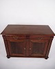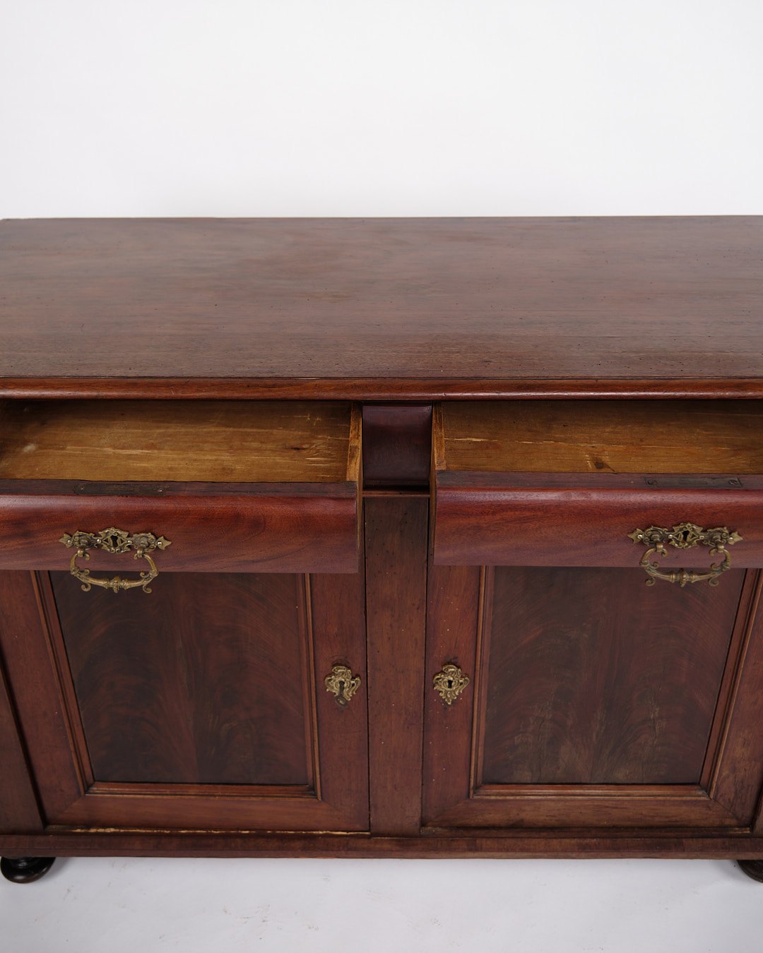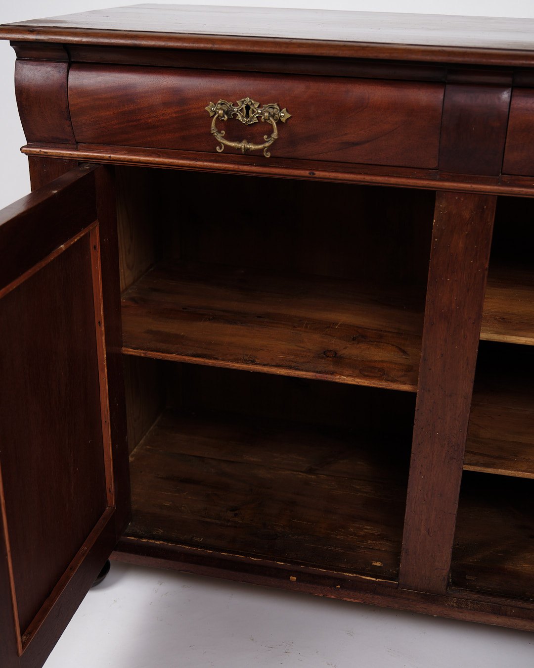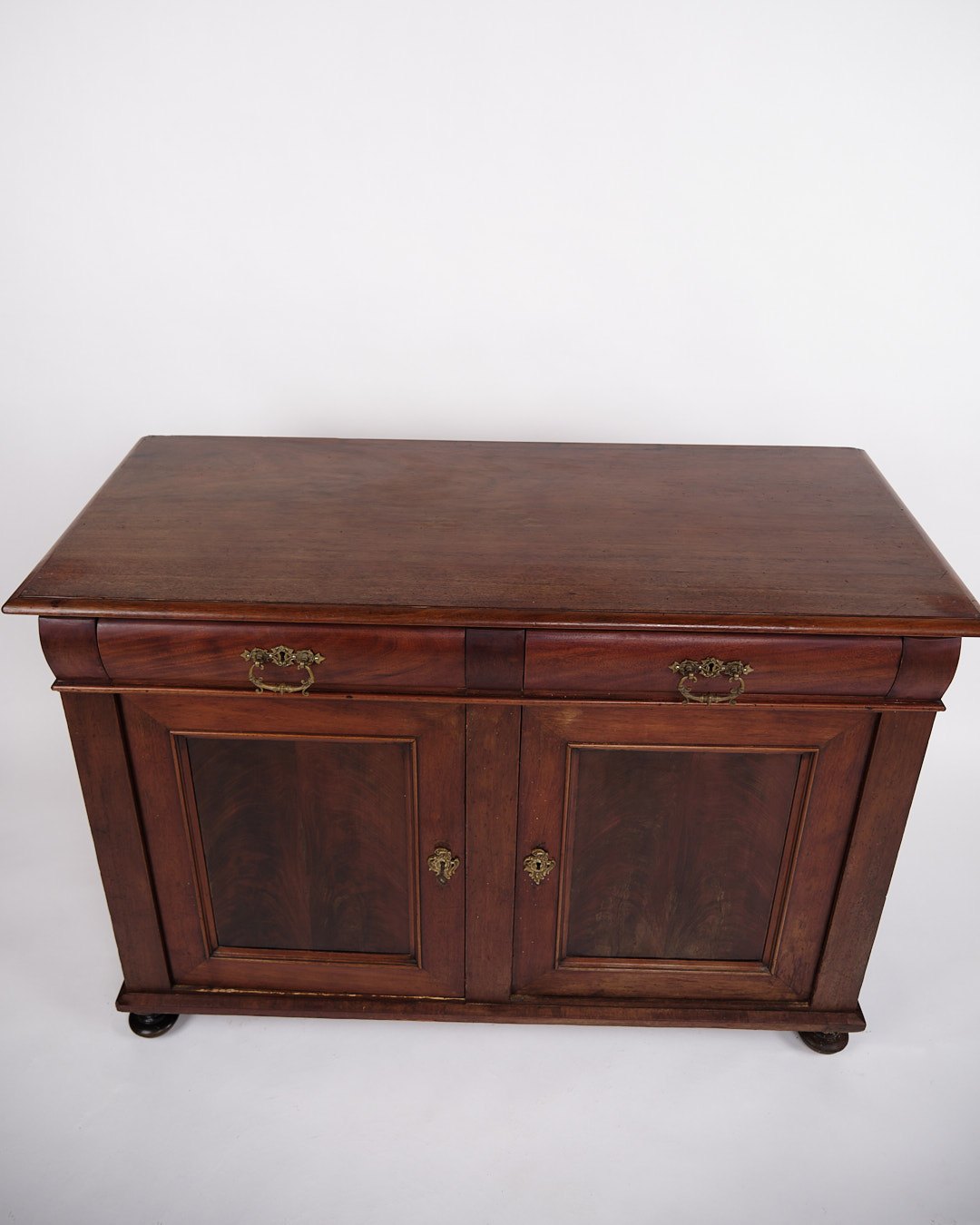 low antique sideboard from the 1880s, made of hand-polished mahogany. The sideboard is furnished with fixed shelves and features period details that testify to the solid joinery craftsmanship of the 19th century.
