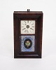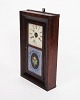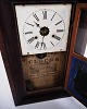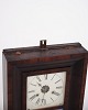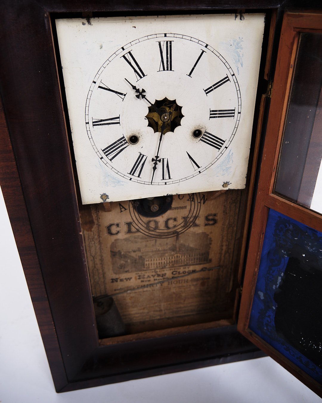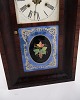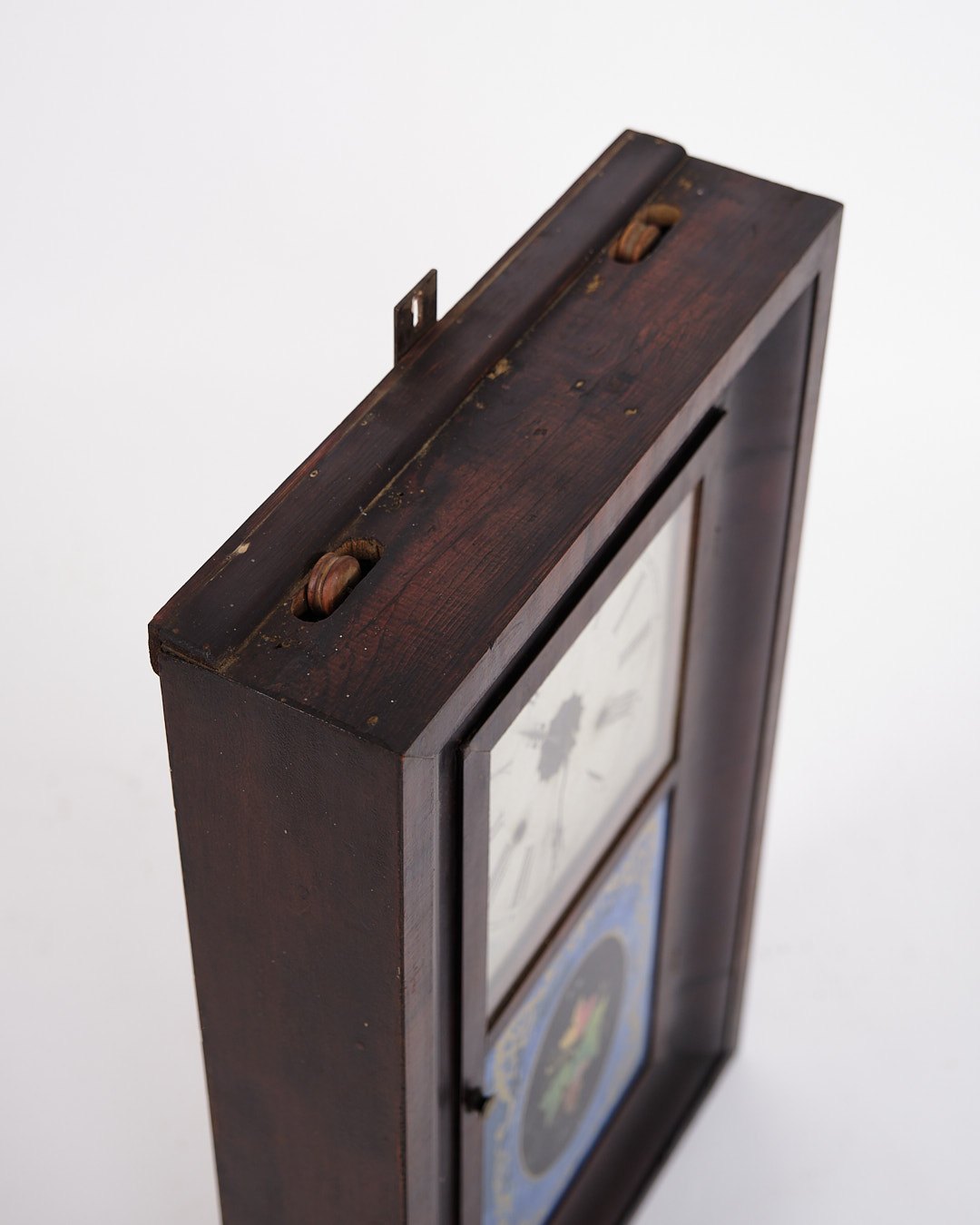 Decorative American clock from the 19th century, made of dark wood. The clock has a classic dial with Roman numerals and a painted glass pane, which gives a charming and period-typical expression.