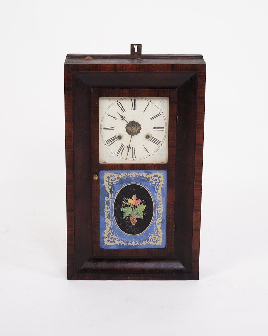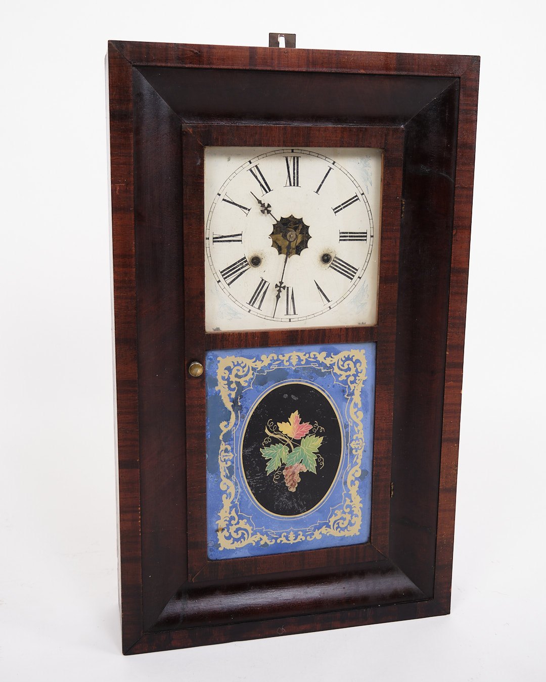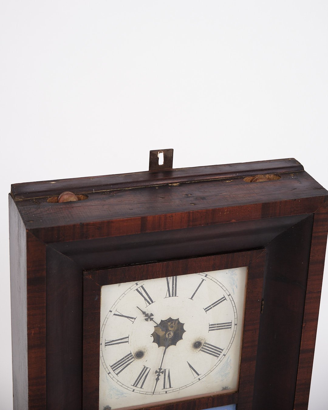 Antique American Clock - Painted Glass Window - Dark Wood - Roman Numeral Dial - 19th Century